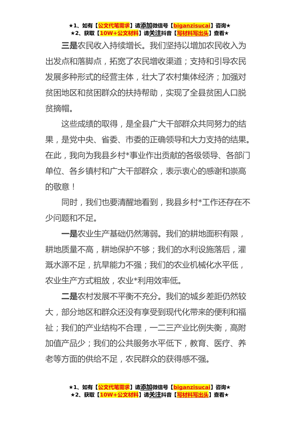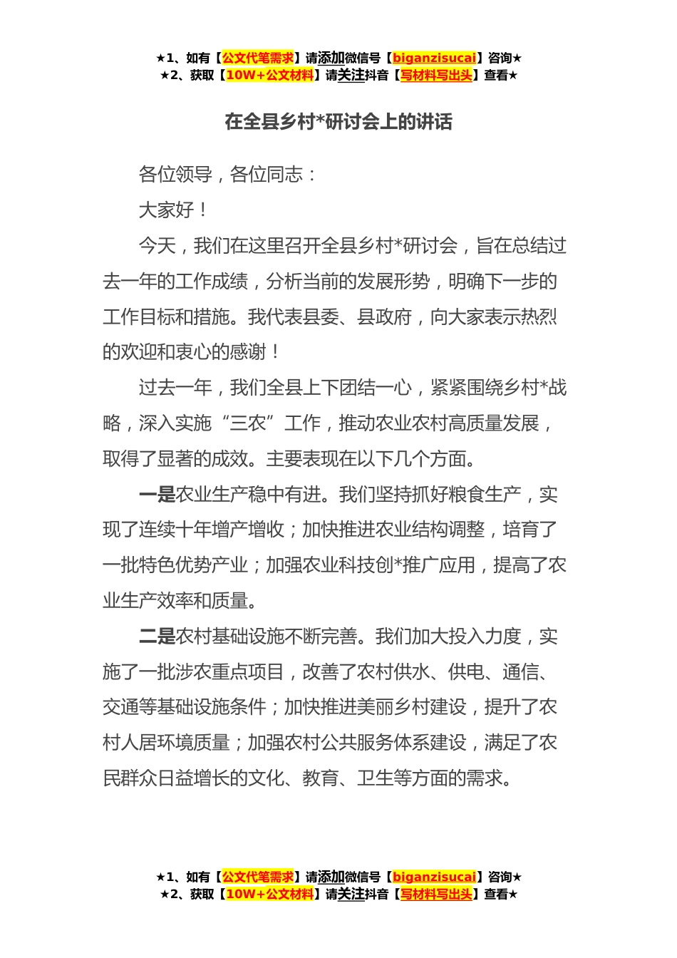 ★1、如有【公文代笔需求】请添加微信号【biganzisucai】咨询★★2、获取【10W+公文材料】请关注抖音【写材料写出头】查看★在全县乡村*研讨会上的讲话各位领导,各位同志:大家好!今天,我们在这里召开全县乡村*研讨会,旨在总结过去一年的工作成绩,分析当前的发展形势,明确下一步的工作目标和措施。我代表县委、县政府,向大家表示热烈的欢迎和衷心的感谢!过去一年,我们全县上下团结一心,紧紧围绕乡村*战略,深入实施“三农”工作,推动农业农村高质量发展,取得了显著的成效。主要表现在以下几个方面。一是农业生产稳中有进。我们坚持抓好粮食生产,实现了连续十年增产增收;加快推进农业结构调整,培育了一批特色优势产业;加强农业科技创*推广应用,提高了农业生产效率和质量。二是农村基础设施不断完...