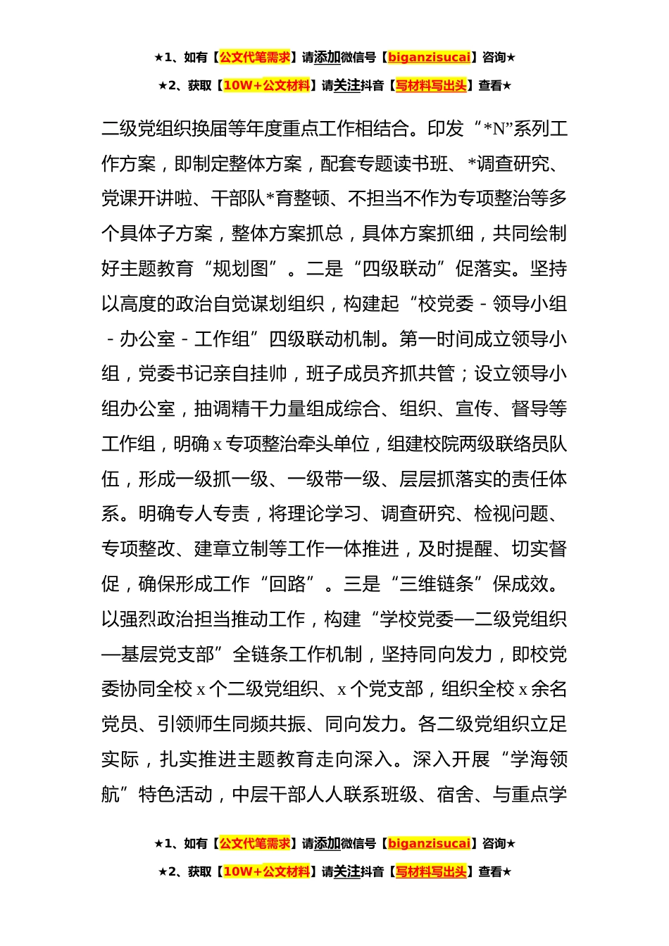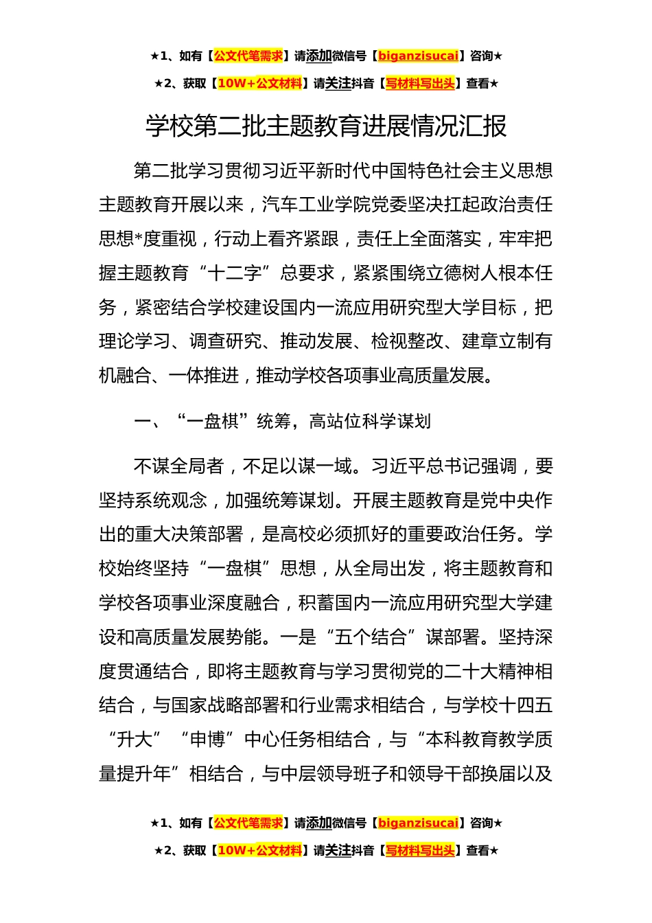 ★1、如有【公文代笔需求】请添加微信号【biganzisucai】咨询★★2、获取【10W+公文材料】请关注抖音【写材料写出头】查看★学校第二批主题教育进展情况汇报第二批学习贯彻习近平新时代中国特色社会主义思想主题教育开展以来,汽车工业学院党委坚决扛起政治责任思想*度重视,行动上看齐紧跟,责任上全面落实,牢牢把握主题教育“十二字”总要求,紧紧围绕立德树人根本任务,紧密结合学校建设国内一流应用研究型大学目标,把理论学习、调查研究、推动发展、检视整改、建章立制有机融合、一体推进,推动学校各项事业高质量发展。一、“一盘棋”统筹,高站位科学谋划不谋全局者,不足以谋一域。习近平总书记强调,要坚持系统观念,加强统筹谋划。开展主题教育是党中央作出的重大决策部署,是高校必须抓好的重要政治任...