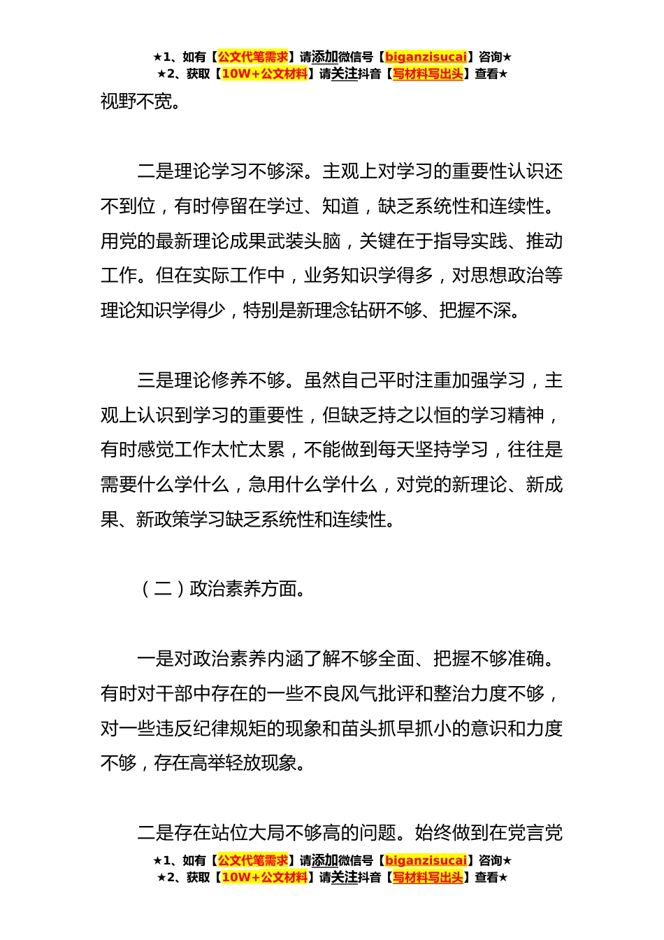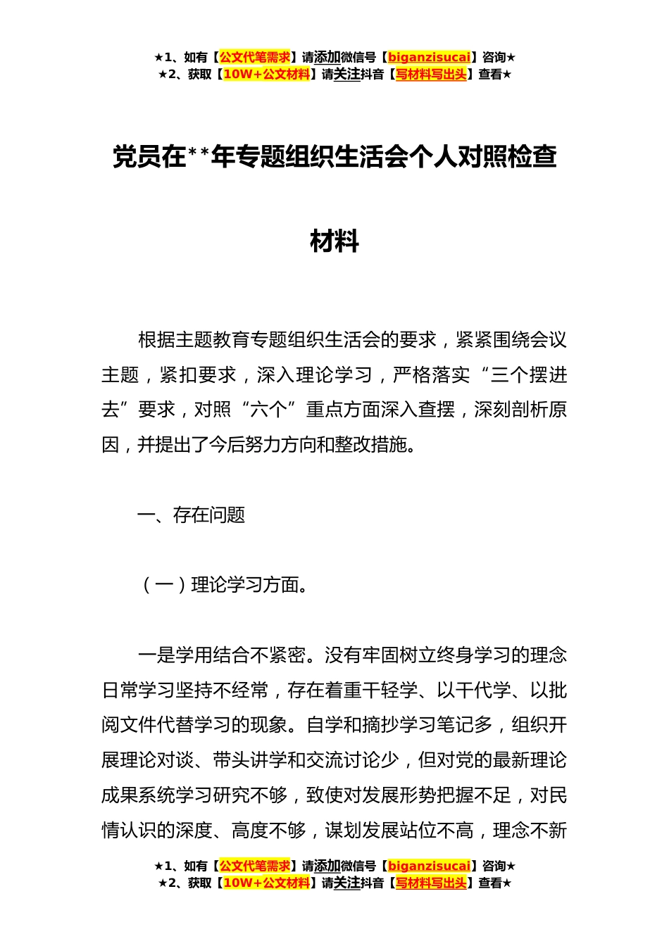 ★1、如有【公文代笔需求】请添加微信号【biganzisucai】咨询★★2、获取【10W+公文材料】请关注抖音【写材料写出头】查看★党员在**年专题组织生活会个人对照检查材料根据主题教育专题组织生活会的要求,紧紧围绕会议主题,紧扣要求,深入理论学习,严格落实“三个摆进去”要求,对照“六个”重点方面深入查摆,深刻剖析原因,并提出了今后努力方向和整改措施。一、存在问题(一)理论学习方面。一是学用结合不紧密。没有牢固树立终身学习的理念日常学习坚持不经常,存在着重干轻学、以干代学、以批阅文件代替学习的现象。自学和摘抄学习笔记多,组织开展理论对谈、带头讲学和交流讨论少,但对党的最新理论成果系统学习研究不够,致使对发展形势把握不足,对民情认识的深度、高度不够,谋划发展站位不高,理念不...