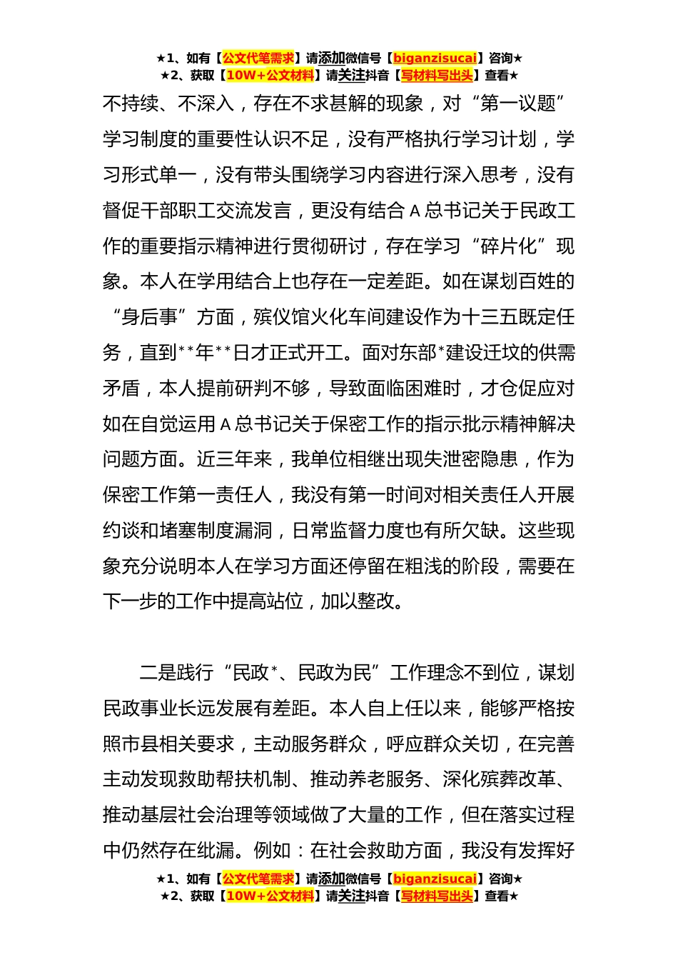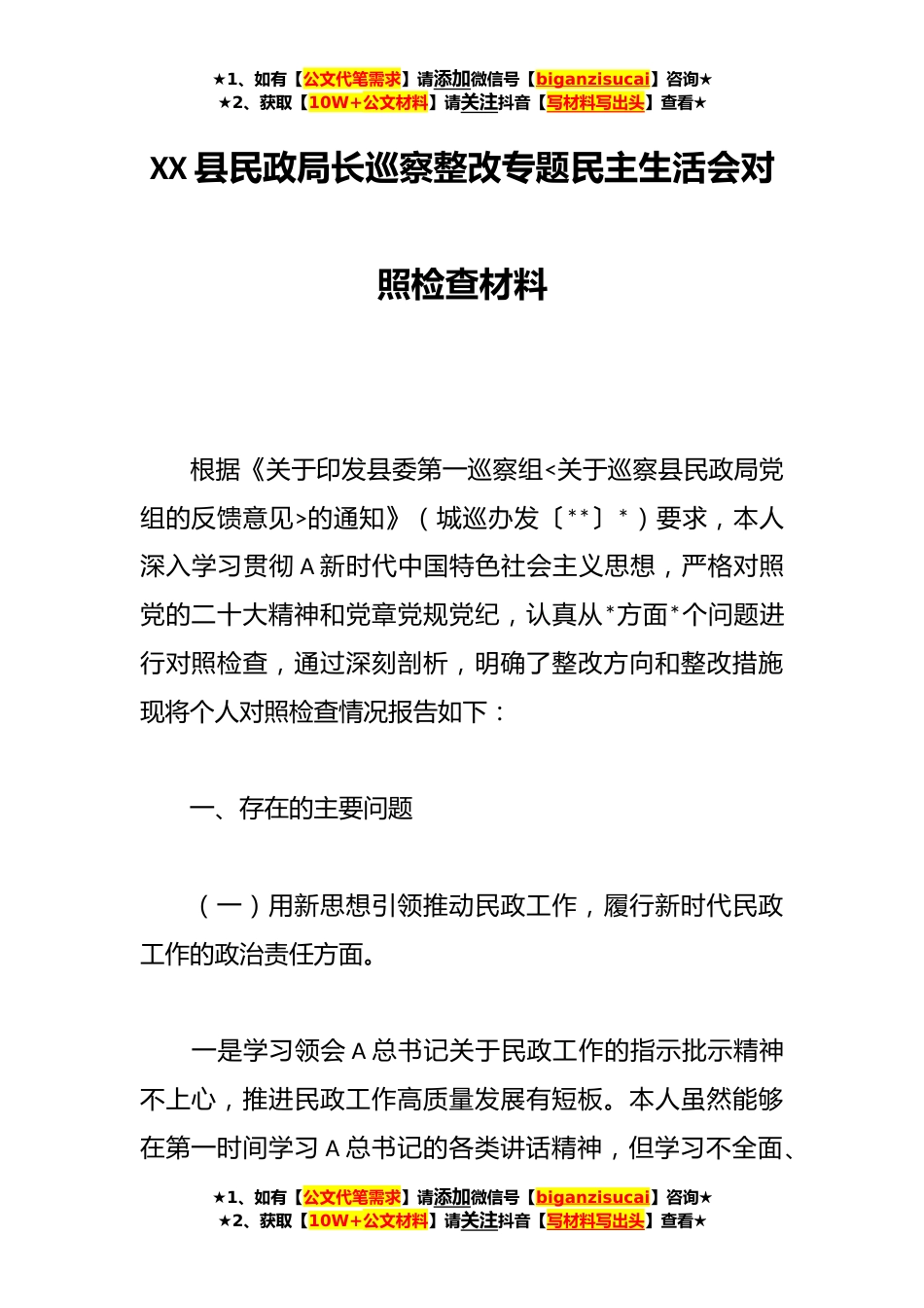 ★1、如有【公文代笔需求】请添加微信号【biganzisucai】咨询★★2、获取【10W+公文材料】请关注抖音【写材料写出头】查看★XX县民政局长巡察整改专题民主生活会对照检查材料根据《关于印发县委第一巡察组<关于巡察县民政局党组的反馈意见>的通知》(城巡办发〔**〕*)要求,本人深入学习贯彻A新时代中国特色社会主义思想,严格对照党的二十大精神和党章党规党纪,认真从*方面*个问题进行对照检查,通过深刻剖析,明确了整改方向和整改措施现将个人对照检查情况报告如下:一、存在的主要问题(一)用新思想引领推动民政工作,履行新时代民政工作的政治责任方面。一是学习领会A总书记关于民政工作的指示批示精神不上心,推进民政工作高质量发展有短板。本人虽然能够在第一时间学习A总书记的各类讲话精神,但学习不...