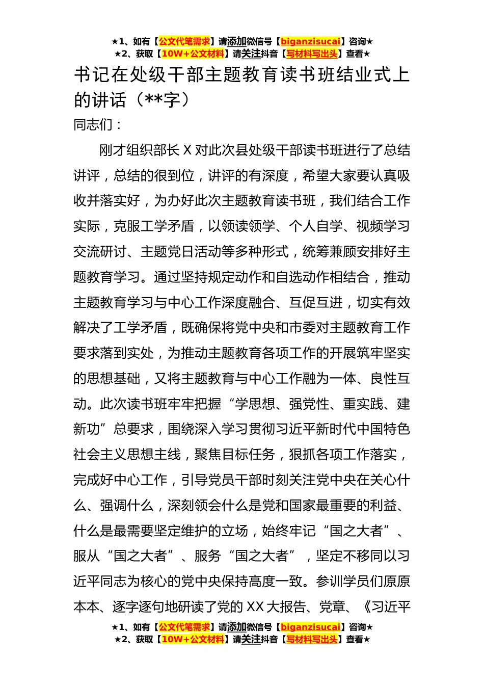 ★1、如有【公文代笔需求】请添加微信号【biganzisucai】咨询★★2、获取【10W+公文材料】请关注抖音【写材料写出头】查看★书记在处级干部主题教育读书班结业式上的讲话(**字)同志们:刚才组织部长X对此次县处级干部读书班进行了总结讲评,总结的很到位,讲评的有深度,希望大家要认真吸收并落实好,为办好此次主题教育读书班,我们结合工作实际,克服工学矛盾,以领读领学、个人自学、视频学习交流研讨、主题党日活动等多种形式,统筹兼顾安排好主题教育学习。通过坚持规定动作和自选动作相结合,推动主题教育学习与中心工作深度融合、互促互进,切实有效解决了工学矛盾,既确保将党中央和市委对主题教育工作要求落到实处,为推动主题教育各项工作的开展筑牢坚实的思想基础,又将主题教育与中心工作融为一体、...
