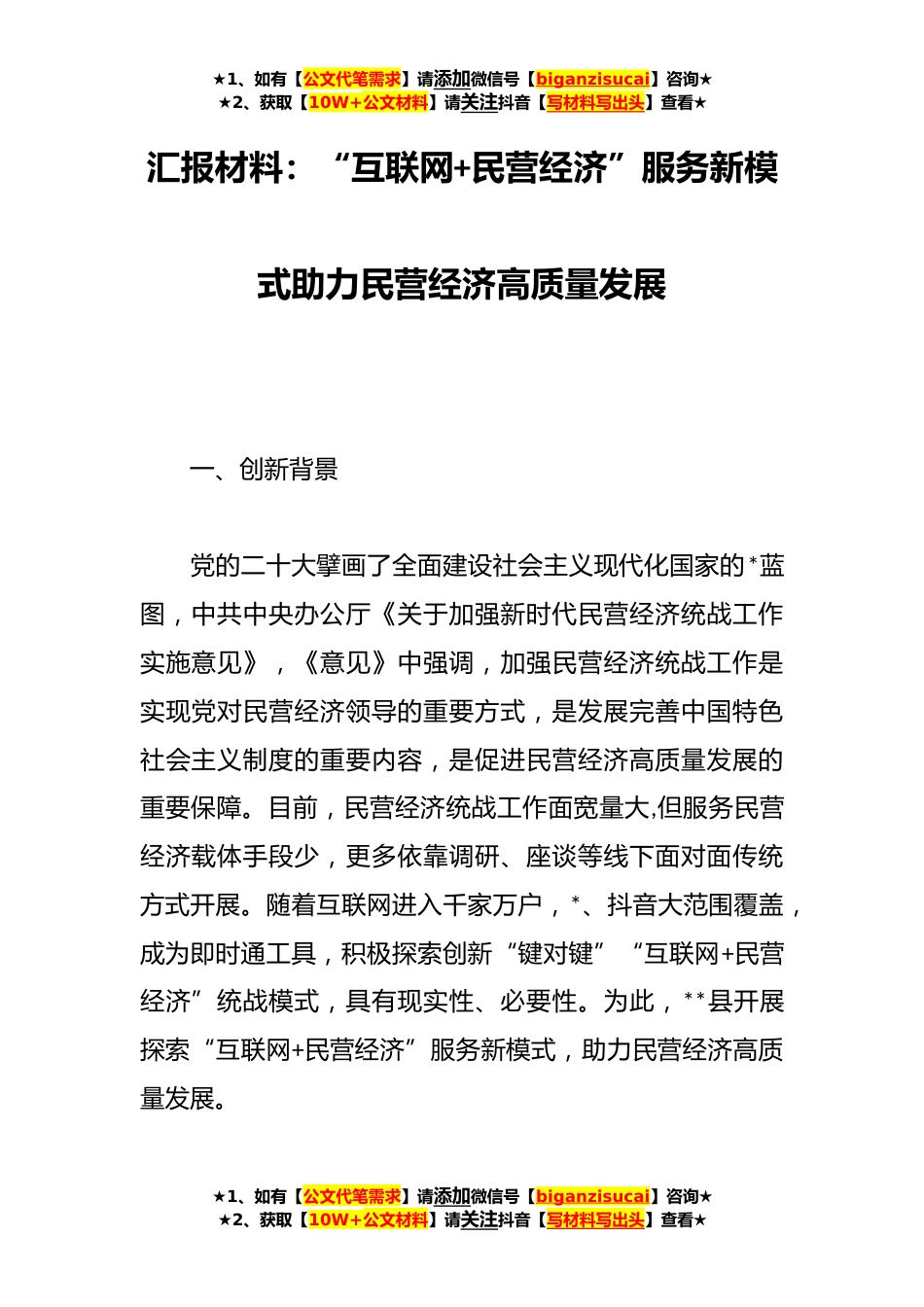 ★1、如有【公文代笔需求】请添加微信号【biganzisucai】咨询★★2、获取【10W+公文材料】请关注抖音【写材料写出头】查看★汇报材料:“互联网+民营经济”服务新模式助力民营经济高质量发展一、创新背景党的二十大擘画了全面建设社会主义现代化国家的*蓝图,中共中央办公厅《关于加强新时代民营经济统战工作实施意见》,《意见》中强调,加强民营经济统战工作是实现党对民营经济领导的重要方式,是发展完善中国特色社会主义制度的重要内容,是促进民营经济高质量发展的重要保障。目前,民营经济统战工作面宽量大,但服务民营经济载体手段少,更多依靠调研、座谈等线下面对面传统方式开展。随着互联网进入千家万户,*、抖音大范围覆盖,成为即时通工具,积极探索创新“键对键”“互联网+民营经济”统战模式,具有现...