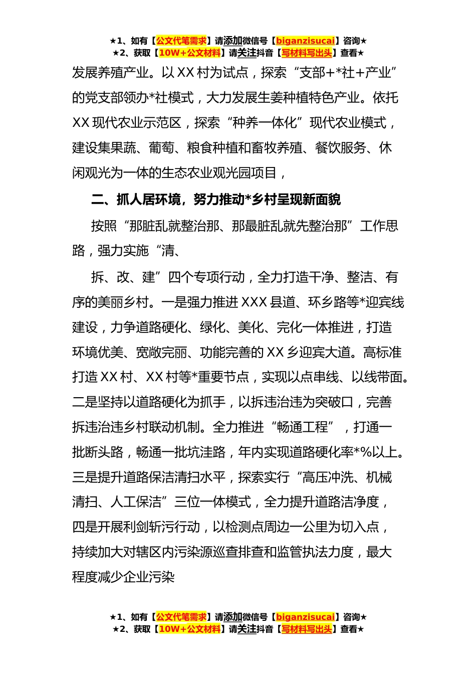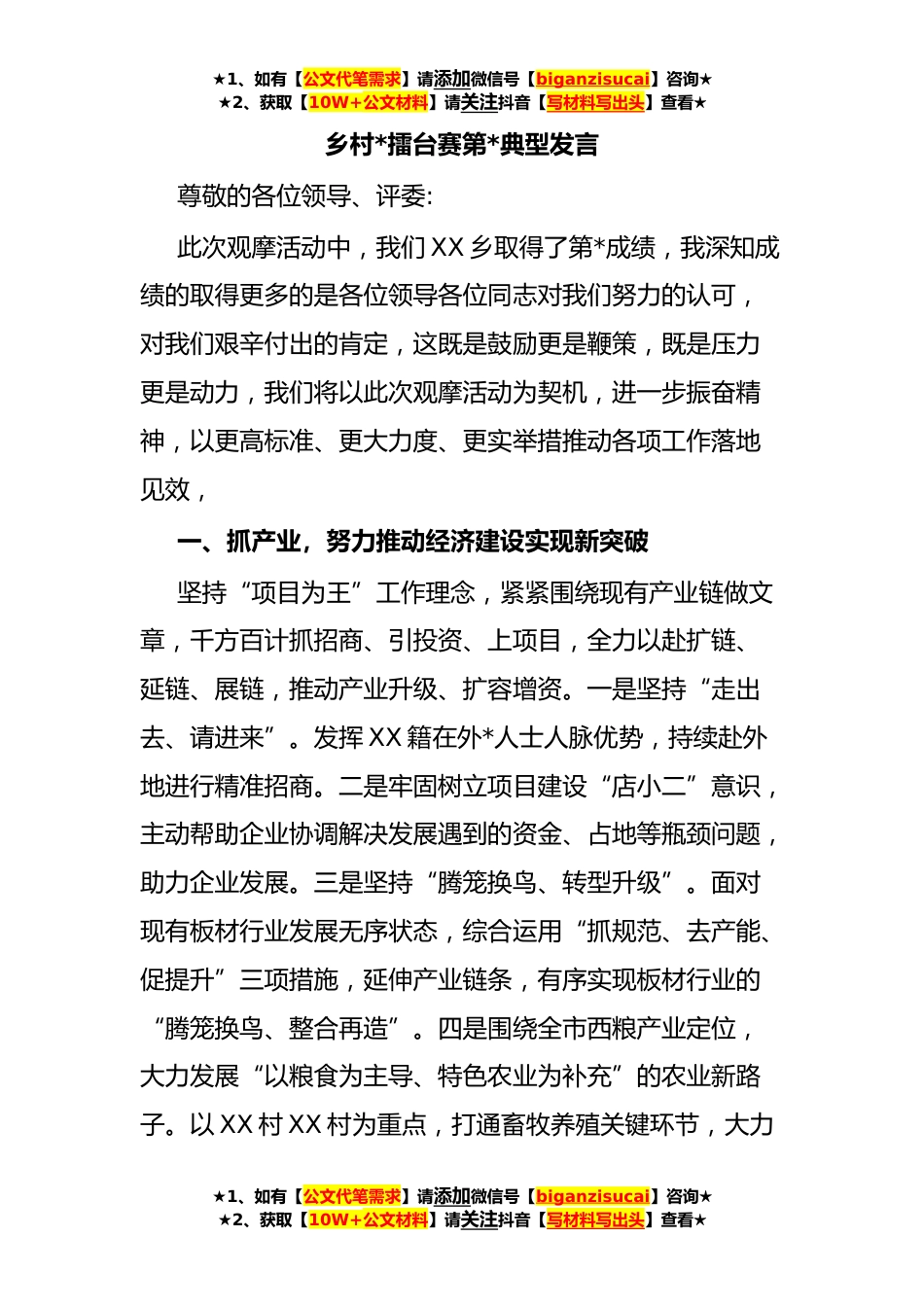 ★1、如有【公文代笔需求】请添加微信号【biganzisucai】咨询★★2、获取【10W+公文材料】请关注抖音【写材料写出头】查看★乡村*擂台赛第*典型发言尊敬的各位领导、评委:此次观摩活动中,我们XX乡取得了第*成绩,我深知成绩的取得更多的是各位领导各位同志对我们努力的认可,对我们艰辛付出的肯定,这既是鼓励更是鞭策,既是压力更是动力,我们将以此次观摩活动为契机,进一步振奋精神,以更高标准、更大力度、更实举措推动各项工作落地见效,一、抓产业,努力推动经济建设实现新突破坚持“项目为王”工作理念,紧紧围绕现有产业链做文章,千方百计抓招商、引投资、上项目,全力以赴扩链、延链、展链,推动产业升级、扩容增资。一是坚持“走出去、请进来”。发挥XX籍在外*人士人脉优势,持续赴外地进行精准招商。...