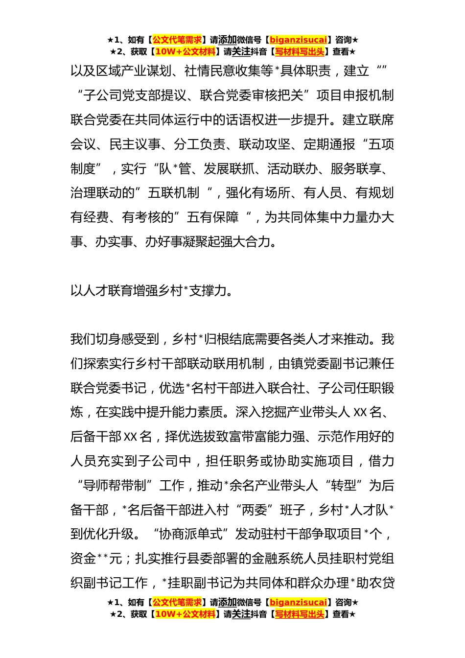 ★1、如有【公文代笔需求】请添加微信号【biganzisucai】咨询★★2、获取【10W+公文材料】请关注抖音【写材料写出头】查看★经验做法:坚持问题导向力破发展瓶颈以区域党建共同体助推乡村全面*XX镇是纯移民乡镇,辖*个村、*社区,常住人口6*余人。近年来,全镇上下认真学习贯彻习近平总书记视察XX重要讲话指示批示精神,坚持党建引领乡村*,深入实施基层党组织建设提质增效工程,组建区域党建共同体,倾力破解组织引领、队*设、产业发展、基层治理等方面的堵点难点问题,以高质量党建赋能高质量发展。以组织联建增强乡村*牵引力。我们深知“众人*火焰高”的道理,积极转变就村抓村固化思维,摸索“协同作战”的发展之路,整合全镇*个村集体经济*社组建众志成联合社,成立“联合党委”,立足电商直播、枸杞种植等产...