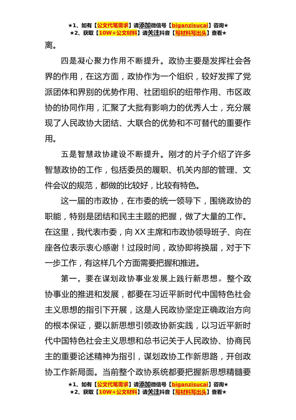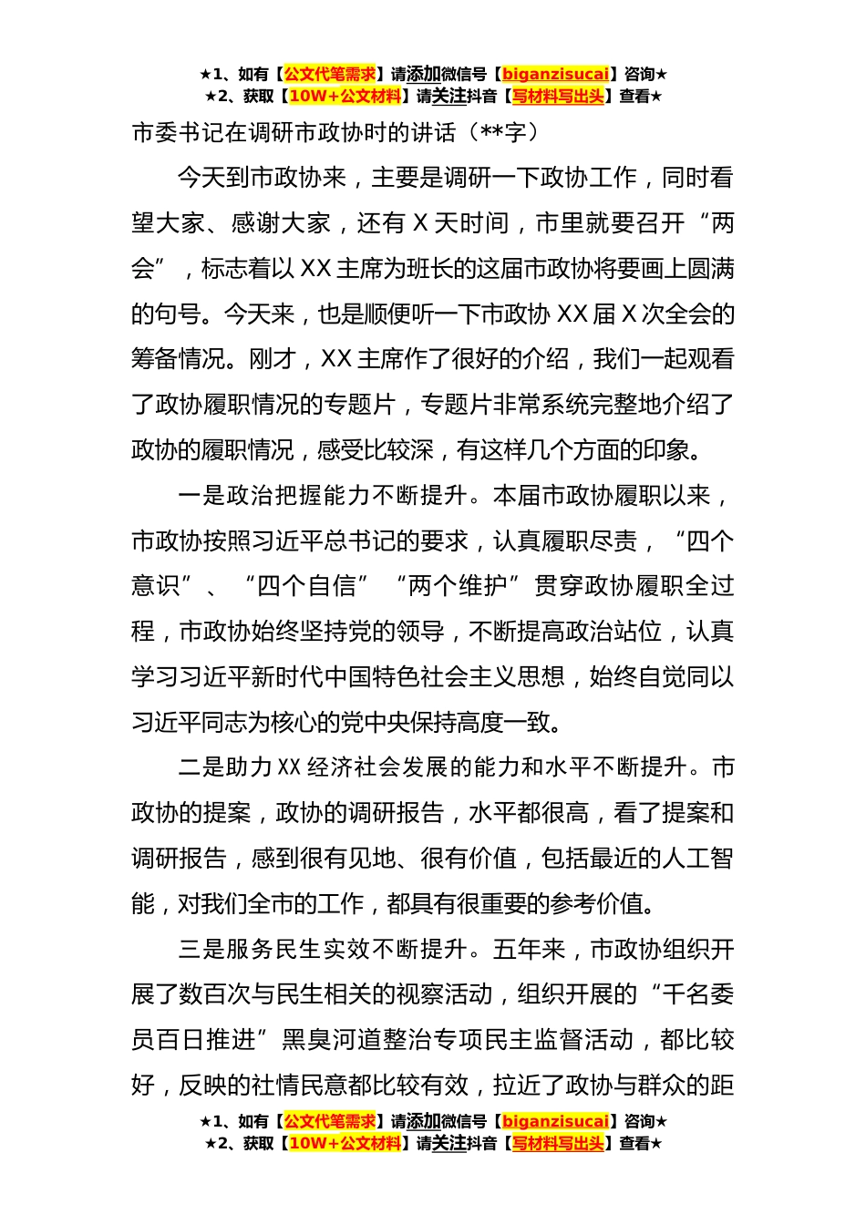 ★1、如有【公文代笔需求】请添加微信号【biganzisucai】咨询★★2、获取【10W+公文材料】请关注抖音【写材料写出头】查看★市委书记在调研市政协时的讲话(**字)今天到市政协来,主要是调研一下政协工作,同时看望大家、感谢大家,还有X天时间,市里就要召开“两会”,标志着以XX主席为班长的这届市政协将要画上圆满的句号。今天来,也是顺便听一下市政协XX届X次全会的筹备情况。刚才,XX主席作了很好的介绍,我们一起观看了政协履职情况的专题片,专题片非常系统完整地介绍了政协的履职情况,感受比较深,有这样几个方面的印象。一是政治把握能力不断提升。本届市政协履职以来,市政协按照习近平总书记的要求,认真履职尽责,“四个意识”、“四个自信”“两个维护”贯穿政协履职全过程,市政协始终坚持党的领...