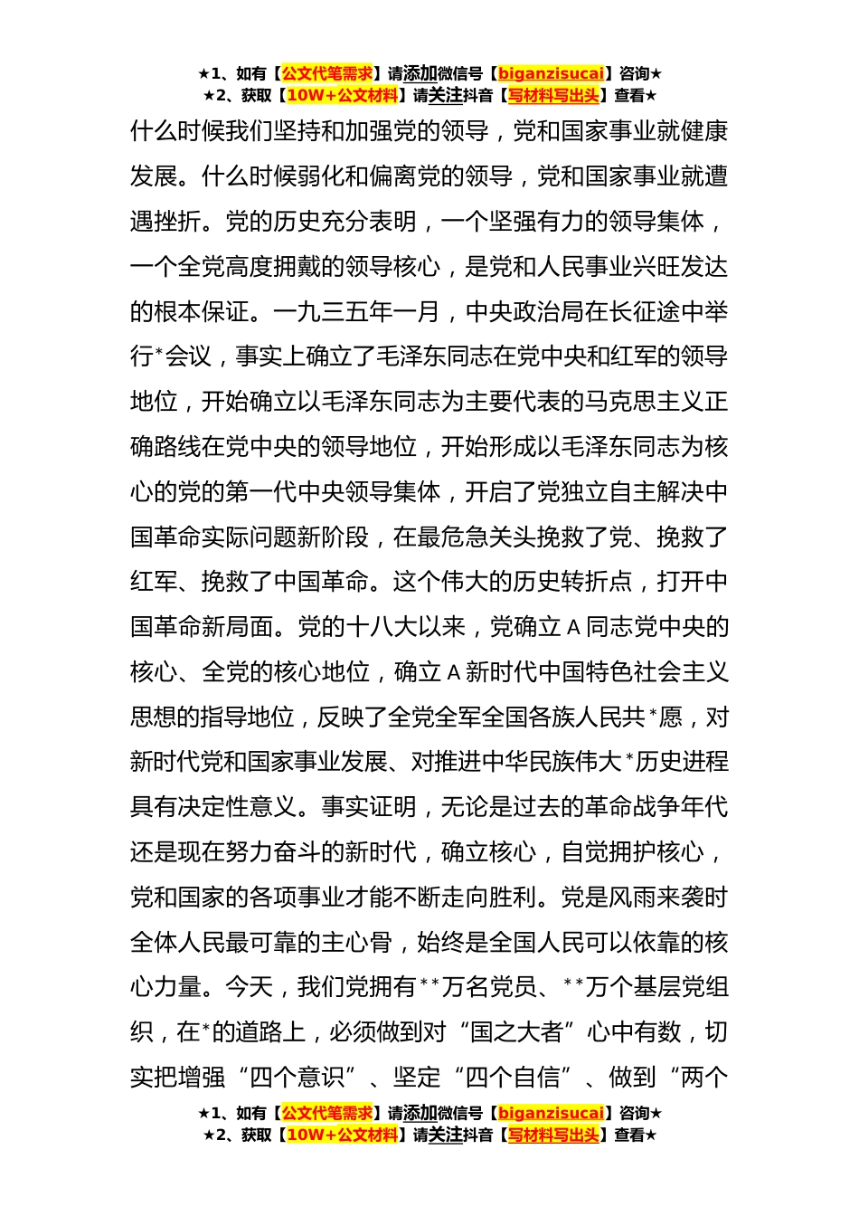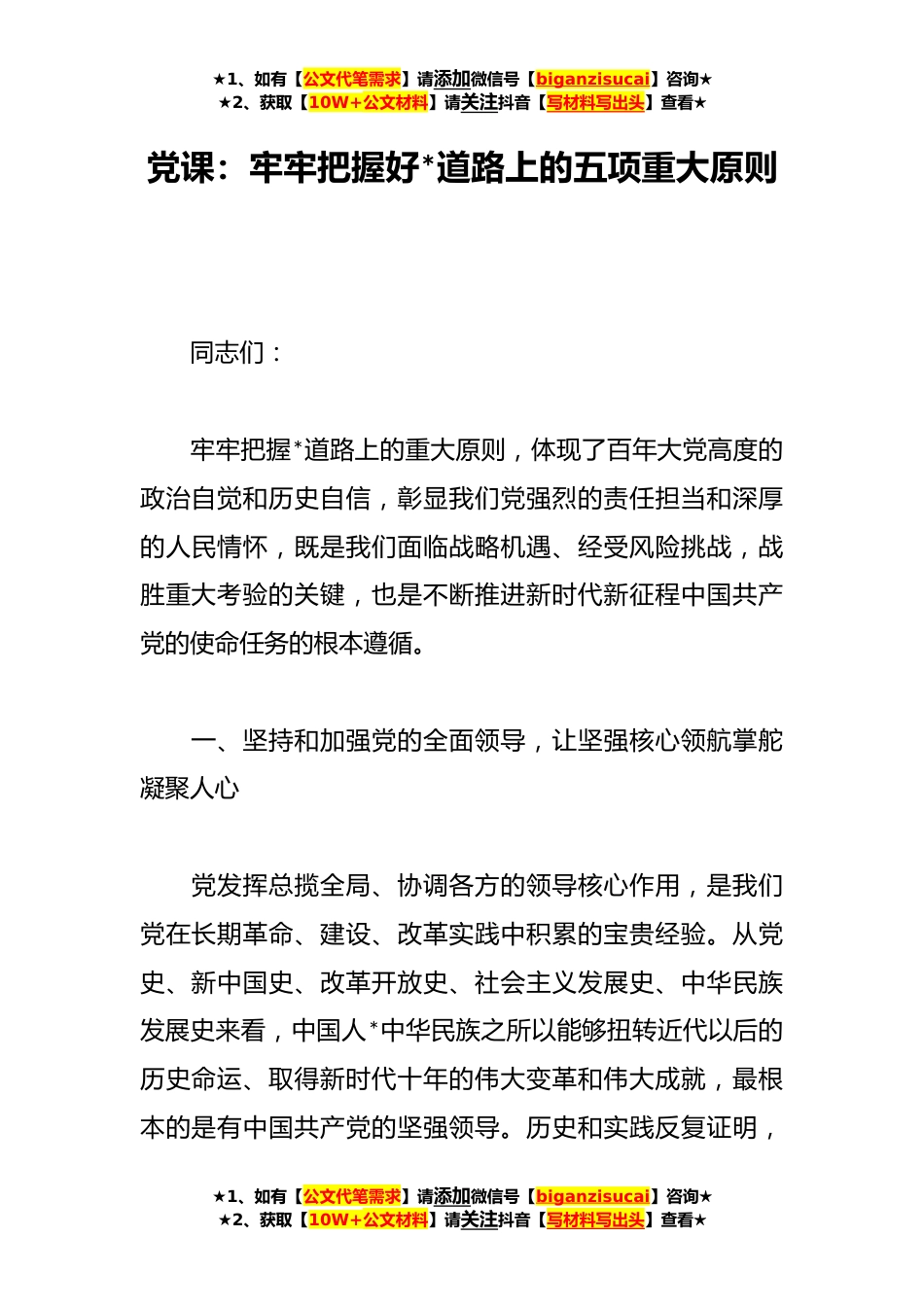 ★1、如有【公文代笔需求】请添加微信号【biganzisucai】咨询★★2、获取【10W+公文材料】请关注抖音【写材料写出头】查看★党课:牢牢把握好*道路上的五项重大原则同志们:牢牢把握*道路上的重大原则,体现了百年大党高度的政治自觉和历史自信,彰显我们党强烈的责任担当和深厚的人民情怀,既是我们面临战略机遇、经受风险挑战,战胜重大考验的关键,也是不断推进新时代新征程中国共产党的使命任务的根本遵循。一、坚持和加强党的全面领导,让坚强核心领航掌舵凝聚人心党发挥总揽全局、协调各方的领导核心作用,是我们党在长期革命、建设、改革实践中积累的宝贵经验。从党史、新中国史、改革开放史、社会主义发展史、中华民族发展史来看,中国人*中华民族之所以能够扭转近代以后的历史命运、取得新时代十年的伟大...