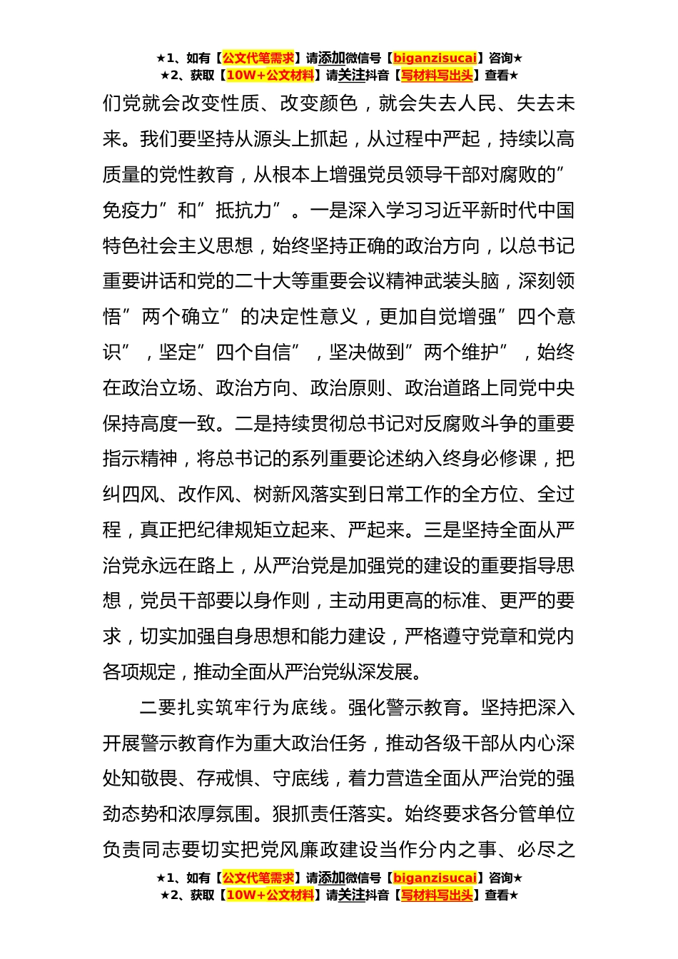 ★1、如有【公文代笔需求】请添加微信号【biganzisucai】咨询★★2、获取【10W+公文材料】请关注抖音【写材料写出头】查看★在理论中心组上警示教育专题研讨班上的交流发言材料(**)党的二十大以来,以习近平同志为核心的党中央坚持以刀刃向内的自我革命精神,全面推进从严治党,多次提出”反腐败斗争形势依然严峻复杂”“必须深化标本兼治、系统治理,一体推进不敢腐、不能腐、不想腐”等重要论述。作为习近平新时代中国特色社会主义思想的重要组成内容,坚持不敢腐、不能腐、不想腐一体推进,不仅是反腐败斗争的基本方针和新时代全面从严治党的重要方略,更是在长期高压反腐和严厉正风肃纪中得出的实践真知,充分体现了我们党在新的历史条件下对党的执政规律、党的建设规律的深刻把握,进一步为全面打赢反腐败...