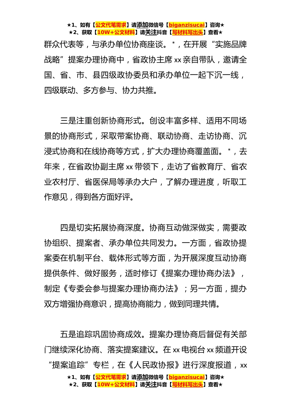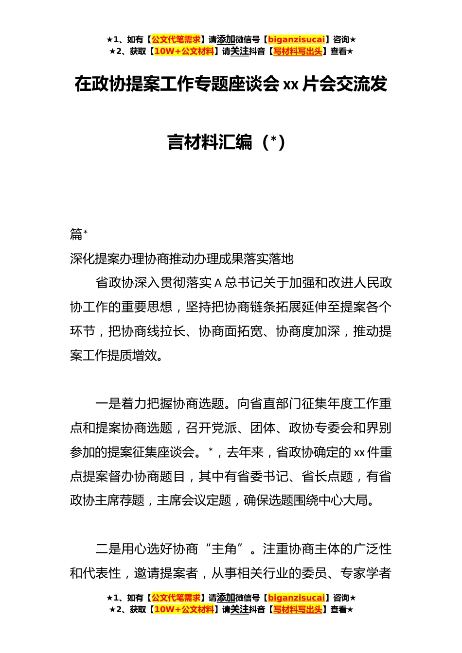 ★1、如有【公文代笔需求】请添加微信号【biganzisucai】咨询★★2、获取【10W+公文材料】请关注抖音【写材料写出头】查看★在政协提案工作专题座谈会xx片会交流发言材料汇编(*)篇*深化提案办理协商推动办理成果落实落地省政协深入贯彻落实A总书记关于加强和改进人民政协工作的重要思想,坚持把协商链条拓展延伸至提案各个环节,把协商线拉长、协商面拓宽、协商度加深,推动提案工作提质增效。一是着力把握协商选题。向省直部门征集年度工作重点和提案协商选题,召开党派、团体、政协专委会和界别参加的提案征集座谈会。*,去年来,省政协确定的xx件重点提案督办协商题目,其中有省委书记、省长点题,有省政协主席荐题,主席会议定题,确保选题围绕中心大局。二是用心选好协商“主角”。注重协商主体的广泛性和...