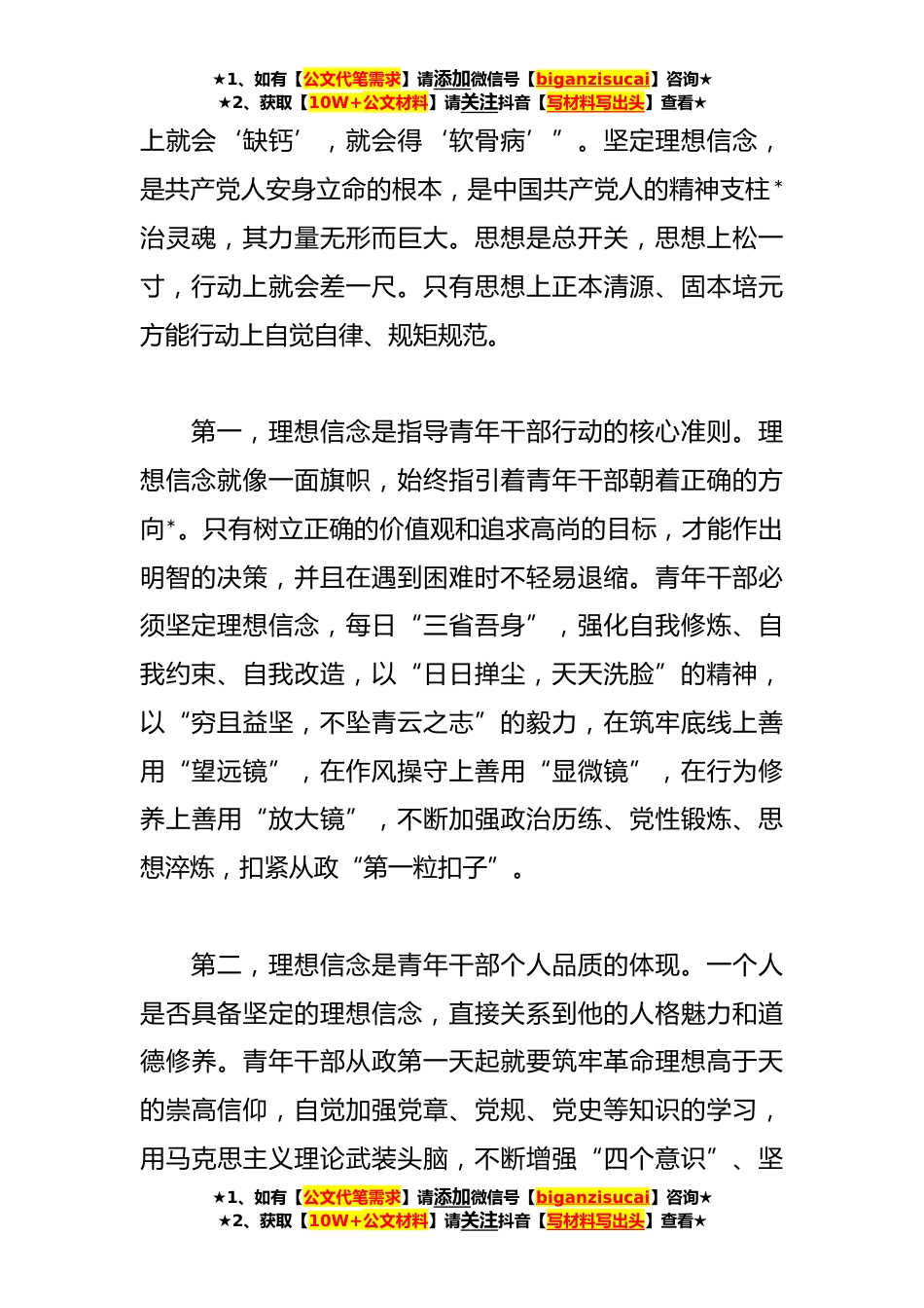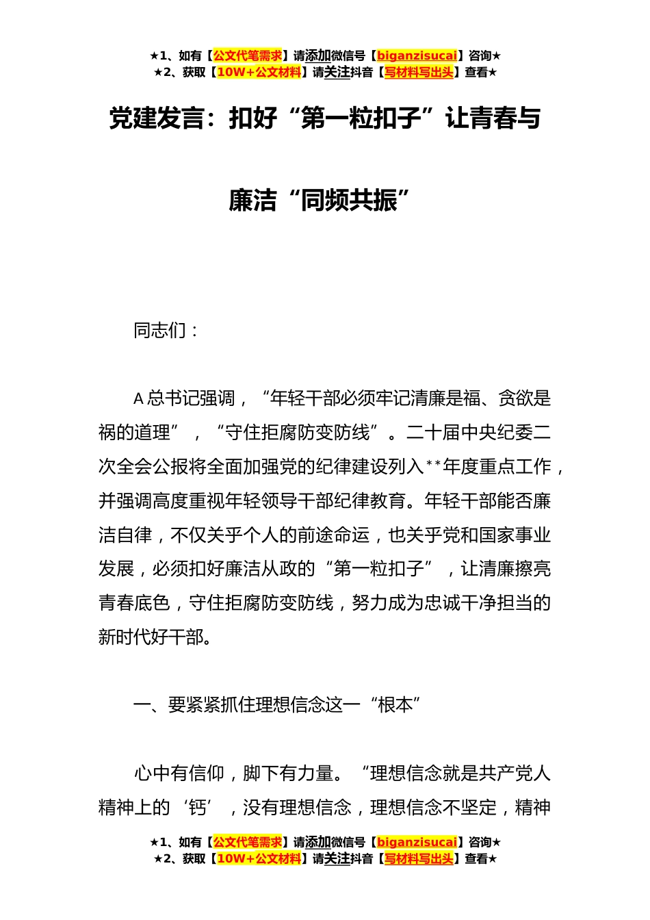 ★1、如有【公文代笔需求】请添加微信号【biganzisucai】咨询★★2、获取【10W+公文材料】请关注抖音【写材料写出头】查看★党建发言:扣好“第一粒扣子”让青春与廉洁“同频共振”同志们:A总书记强调,“年轻干部必须牢记清廉是福、贪欲是祸的道理”,“守住拒腐防变防线”。二十届中央纪委二次全会公报将全面加强党的纪律建设列入**年度重点工作,并强调高度重视年轻领导干部纪律教育。年轻干部能否廉洁自律,不仅关乎个人的前途命运,也关乎党和国家事业发展,必须扣好廉洁从政的“第一粒扣子”,让清廉擦亮青春底色,守住拒腐防变防线,努力成为忠诚干净担当的新时代好干部。一、要紧紧抓住理想信念这一“根本”心中有信仰,脚下有力量。“理想信念就是共产党人精神上的‘钙’,没有理想信念,理想信念不坚定...