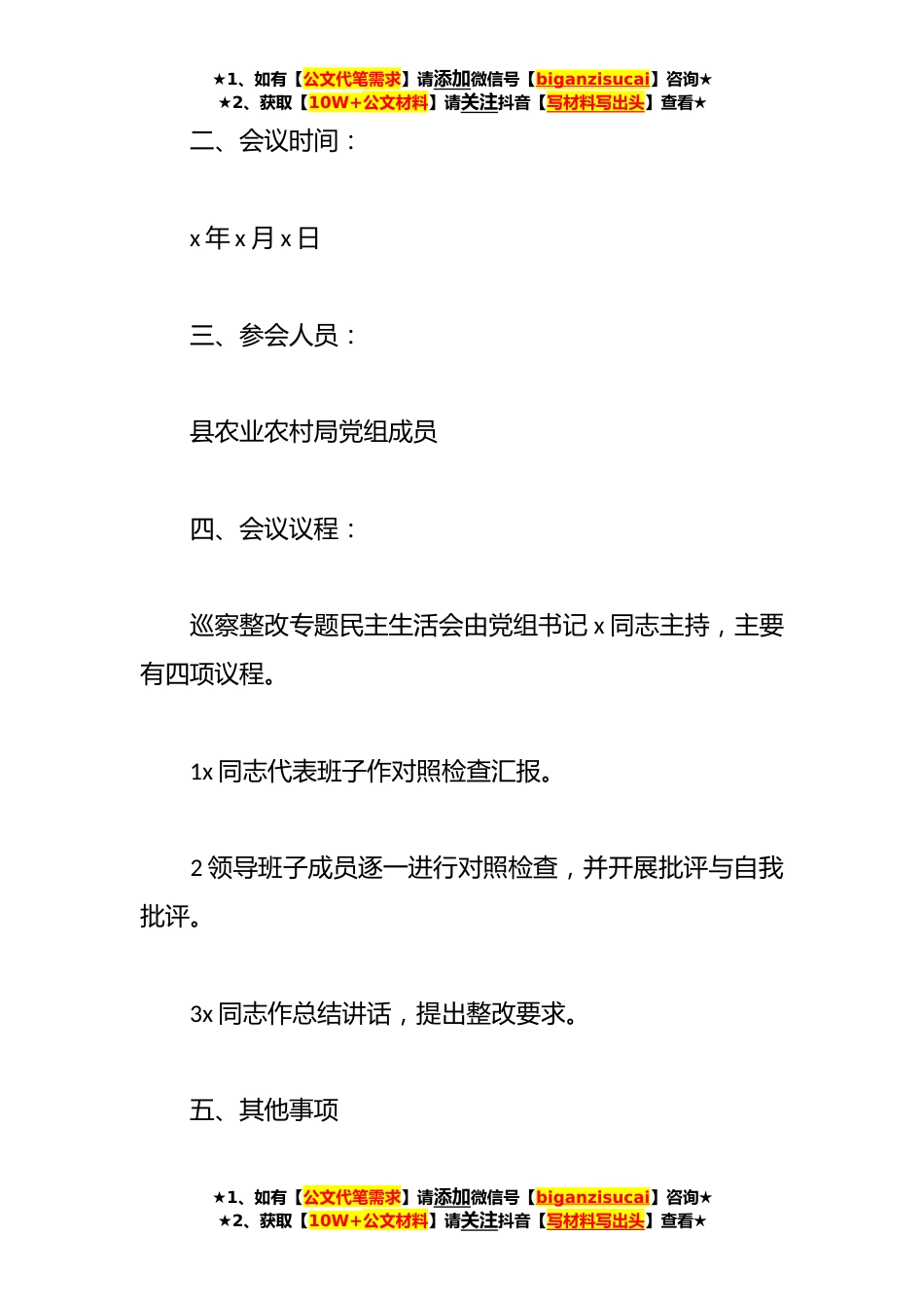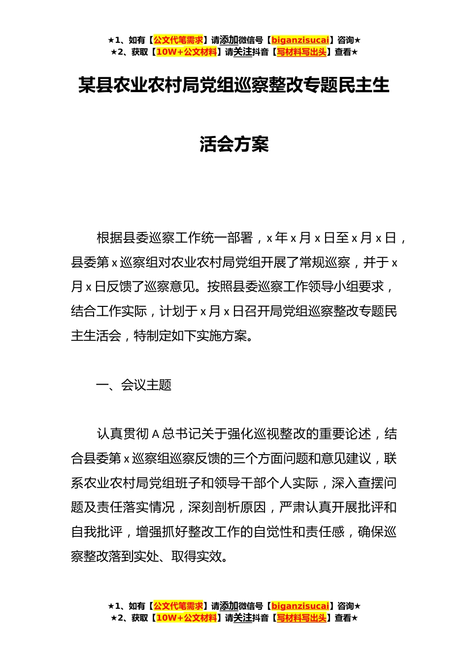 ★1、如有【公文代笔需求】请添加微信号【biganzisucai】咨询★★2、获取【10W+公文材料】请关注抖音【写材料写出头】查看★某县农业农村局党组巡察整改专题民主生活会方案根据县委巡察工作统一部署,x年x月x日至x月x日,县委第x巡察组对农业农村局党组开展了常规巡察,并于x月x日反馈了巡察意见。按照县委巡察工作领导小组要求,结合工作实际,计划于x月x日召开局党组巡察整改专题民主生活会,特制定如下实施方案。一、会议主题认真贯彻A总书记关于强化巡视整改的重要论述,结合县委第x巡察组巡察反馈的三个方面问题和意见建议,联系农业农村局党组班子和领导干部个人实际,深入查摆问题及责任落实情况,深刻剖析原因,严肃认真开展批评和自我批评,增强抓好整改工作的自觉性和责任感,确保巡察整改落到实处、取...