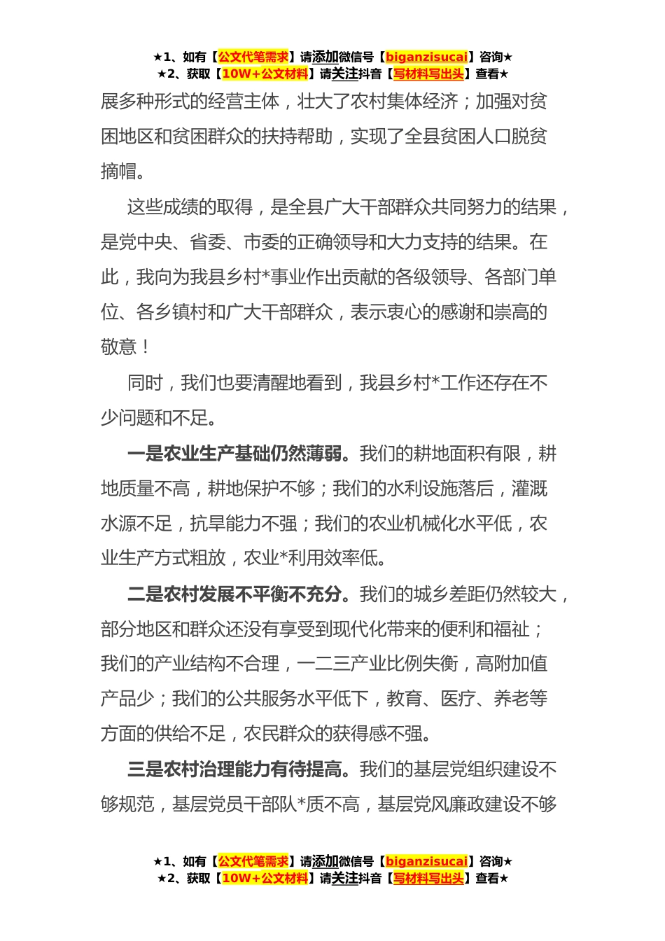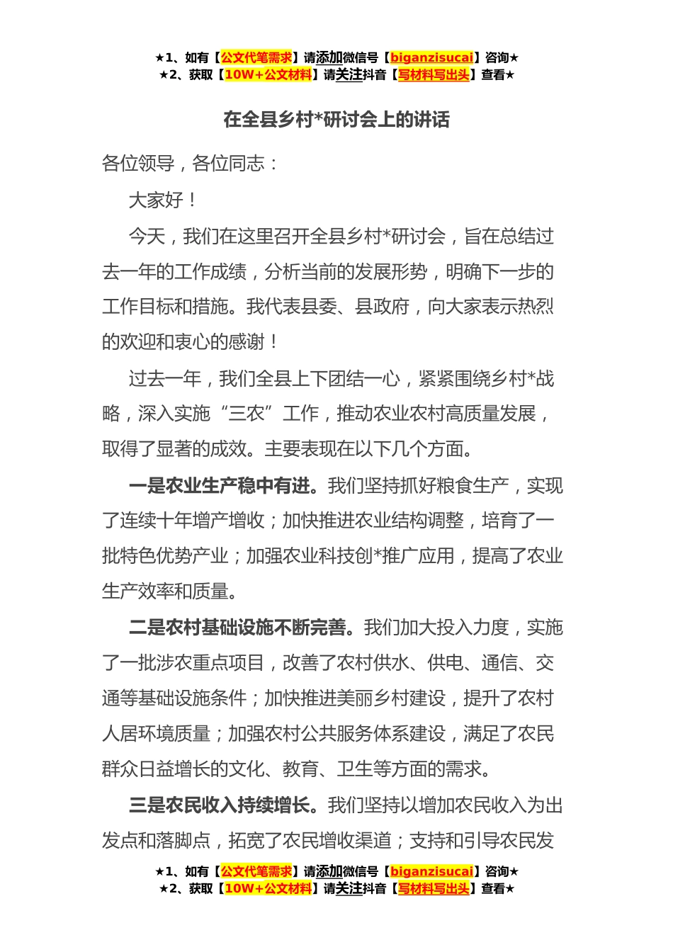 ★1、如有【公文代笔需求】请添加微信号【biganzisucai】咨询★★2、获取【10W+公文材料】请关注抖音【写材料写出头】查看★在全县乡村*研讨会上的讲话各位领导,各位同志:大家好!今天,我们在这里召开全县乡村*研讨会,旨在总结过去一年的工作成绩,分析当前的发展形势,明确下一步的工作目标和措施。我代表县委、县政府,向大家表示热烈的欢迎和衷心的感谢!过去一年,我们全县上下团结一心,紧紧围绕乡村*战略,深入实施“三农”工作,推动农业农村高质量发展,取得了显著的成效。主要表现在以下几个方面。一是农业生产稳中有进。我们坚持抓好粮食生产,实现了连续十年增产增收;加快推进农业结构调整,培育了一批特色优势产业;加强农业科技创*推广应用,提高了农业生产效率和质量。二是农村基础设施不断完...