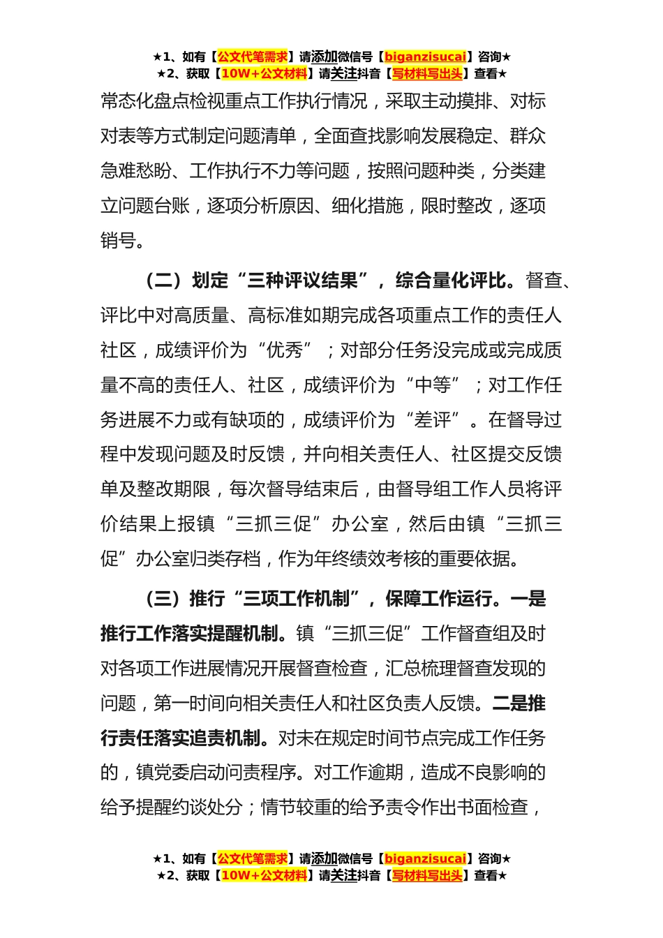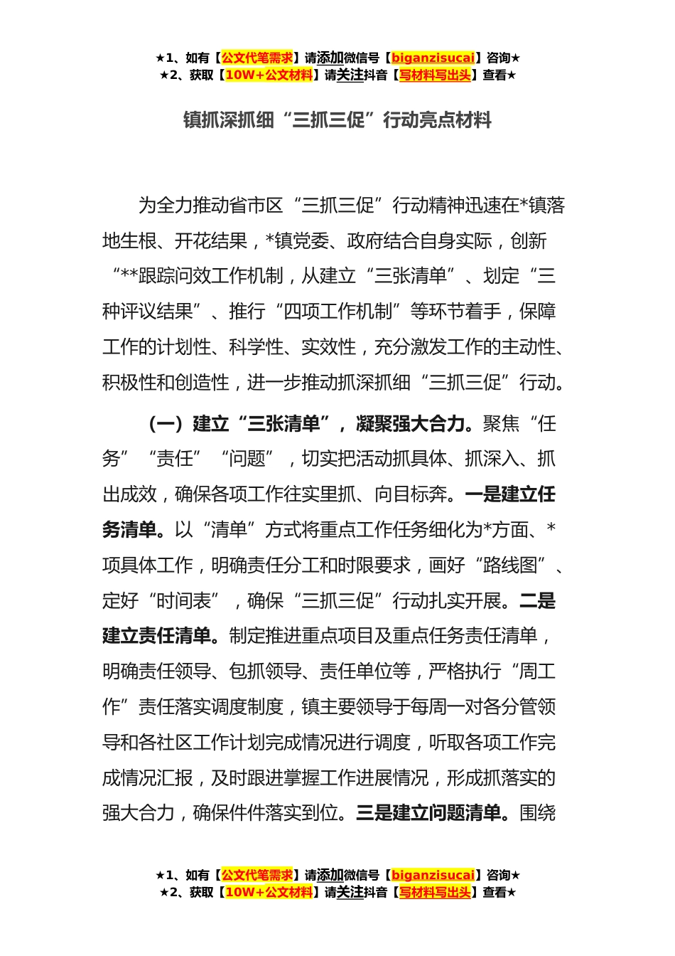 ★1、如有【公文代笔需求】请添加微信号【biganzisucai】咨询★★2、获取【10W+公文材料】请关注抖音【写材料写出头】查看★镇抓深抓细“三抓三促”行动亮点材料为全力推动省市区“三抓三促”行动精神迅速在*镇落地生根、开花结果,*镇党委、政府结合自身实际,创新“**跟踪问效工作机制,从建立“三张清单”、划定“三种评议结果”、推行“四项工作机制”等环节着手,保障工作的计划性、科学性、实效性,充分激发工作的主动性、积极性和创造性,进一步推动抓深抓细“三抓三促”行动。(一)建立“三张清单”,凝聚强大合力。聚焦“任务”“责任”“问题”,切实把活动抓具体、抓深入、抓出成效,确保各项工作往实里抓、向目标奔。一是建立任务清单。以“清单”方式将重点工作任务细化为*方面、*项具体工作,明确...