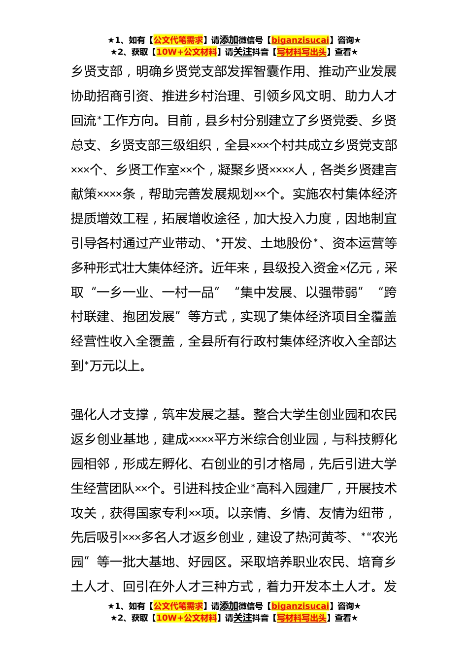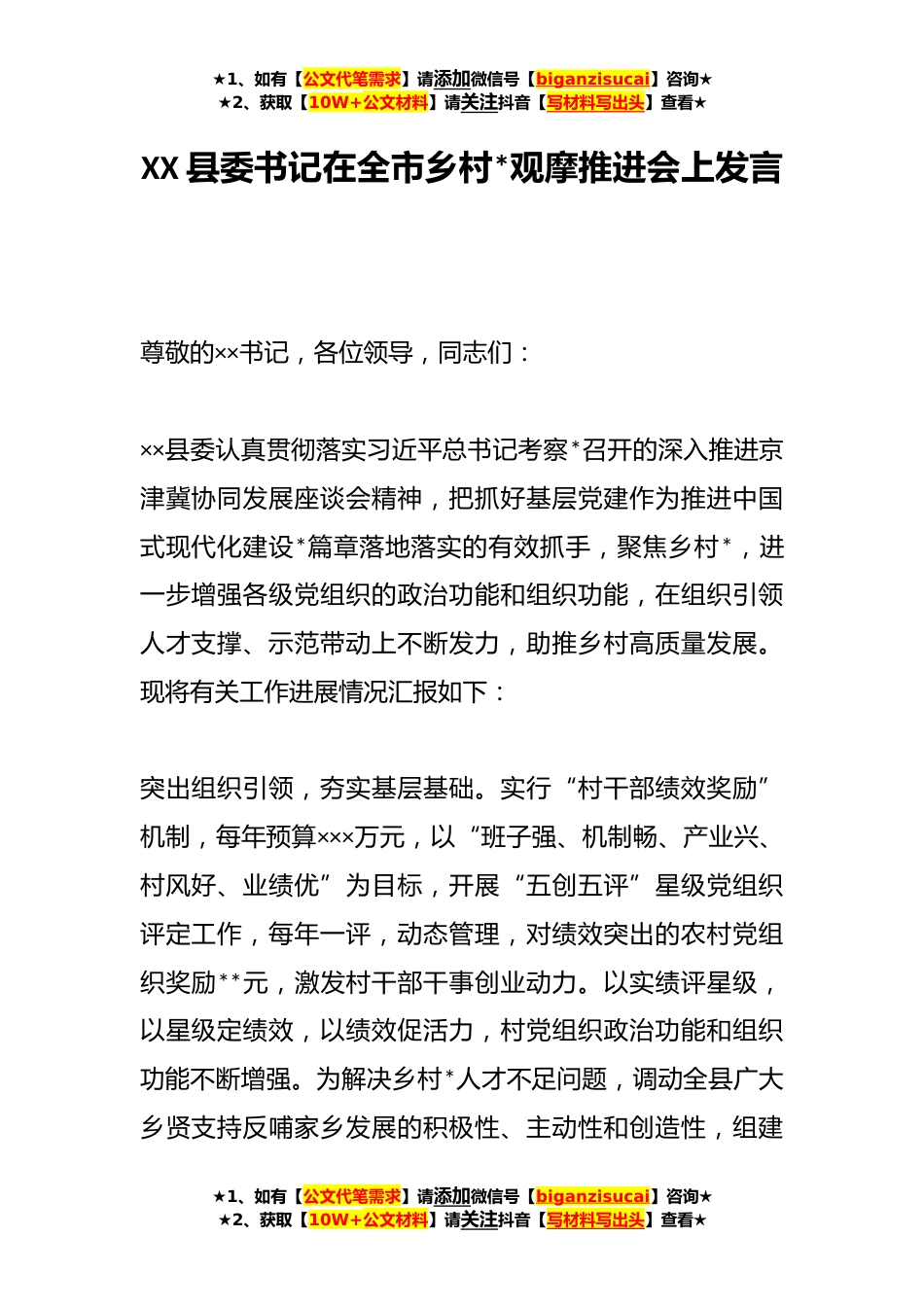 ★1、如有【公文代笔需求】请添加微信号【biganzisucai】咨询★★2、获取【10W+公文材料】请关注抖音【写材料写出头】查看★XX县委书记在全市乡村*观摩推进会上发言尊敬的××书记,各位领导,同志们:××县委认真贯彻落实习近平总书记考察*召开的深入推进京津冀协同发展座谈会精神,把抓好基层党建作为推进中国式现代化建设*篇章落地落实的有效抓手,聚焦乡村*,进一步增强各级党组织的政治功能和组织功能,在组织引领人才支撑、示范带动上不断发力,助推乡村高质量发展。现将有关工作进展情况汇报如下:突出组织引领,夯实基层基础。实行“村干部绩效奖励”机制,每年预算×××万元,以“班子强、机制畅、产业兴、村风好、业绩优”为目标,开展“五创五评”星级党组织评定工作,每年一评,动态管理,对绩效突...