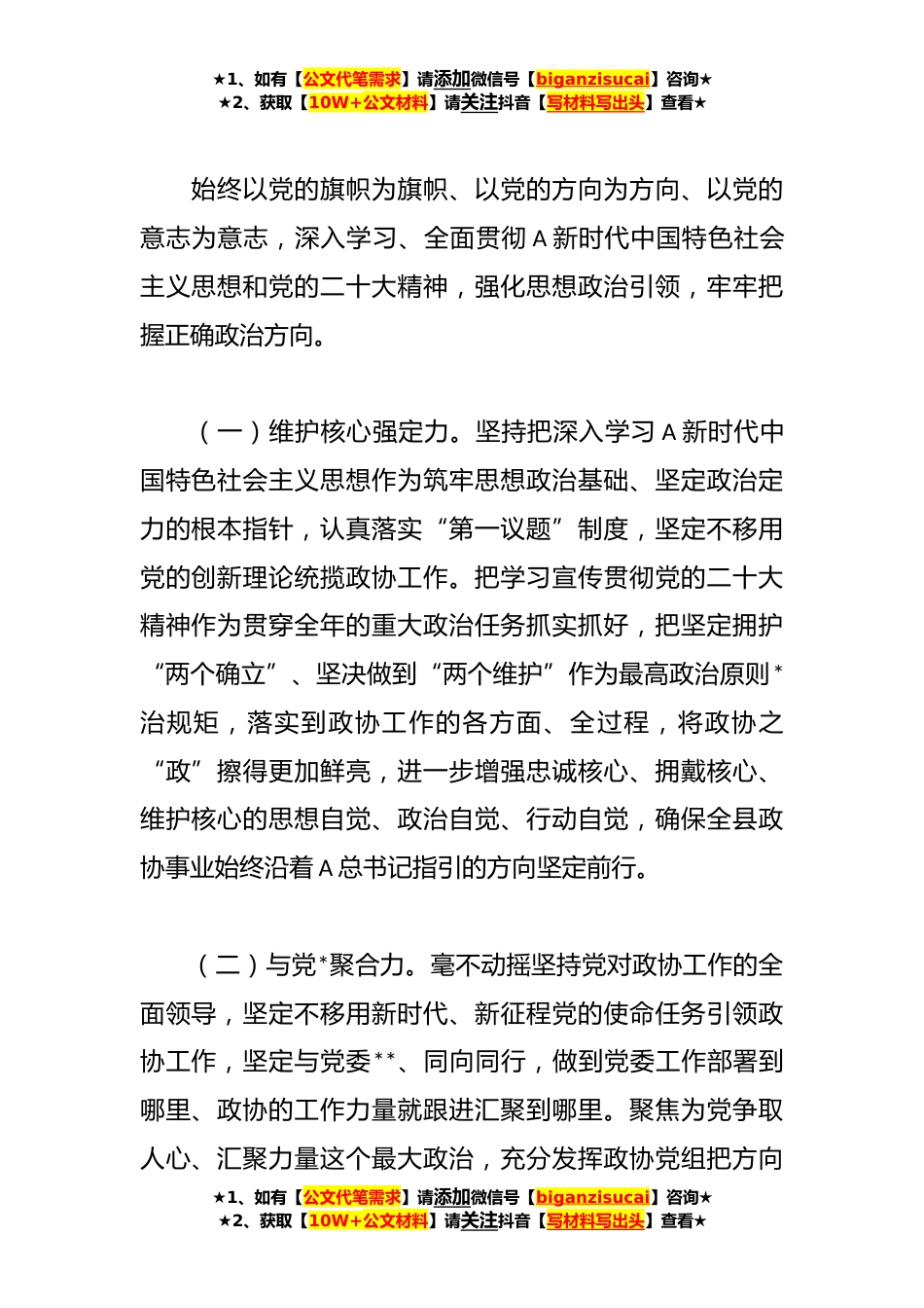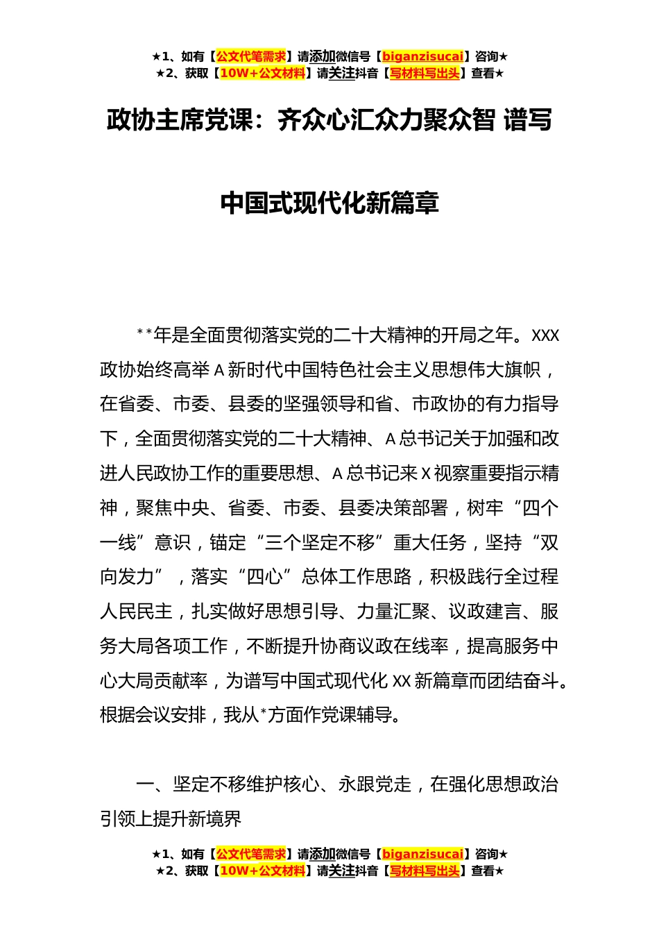 ★1、如有【公文代笔需求】请添加微信号【biganzisucai】咨询★★2、获取【10W+公文材料】请关注抖音【写材料写出头】查看★政协主席党课:齐众心汇众力聚众智谱写中国式现代化新篇章**年是全面贯彻落实党的二十大精神的开局之年。XXX政协始终高举A新时代中国特色社会主义思想伟大旗帜,在省委、市委、县委的坚强领导和省、市政协的有力指导下,全面贯彻落实党的二十大精神、A总书记关于加强和改进人民政协工作的重要思想、A总书记来X视察重要指示精神,聚焦中央、省委、市委、县委决策部署,树牢“四个一线”意识,锚定“三个坚定不移”重大任务,坚持“双向发力”,落实“四心”总体工作思路,积极践行全过程人民民主,扎实做好思想引导、力量汇聚、议政建言、服务大局各项工作,不断提升协商议政在线率,提高服...