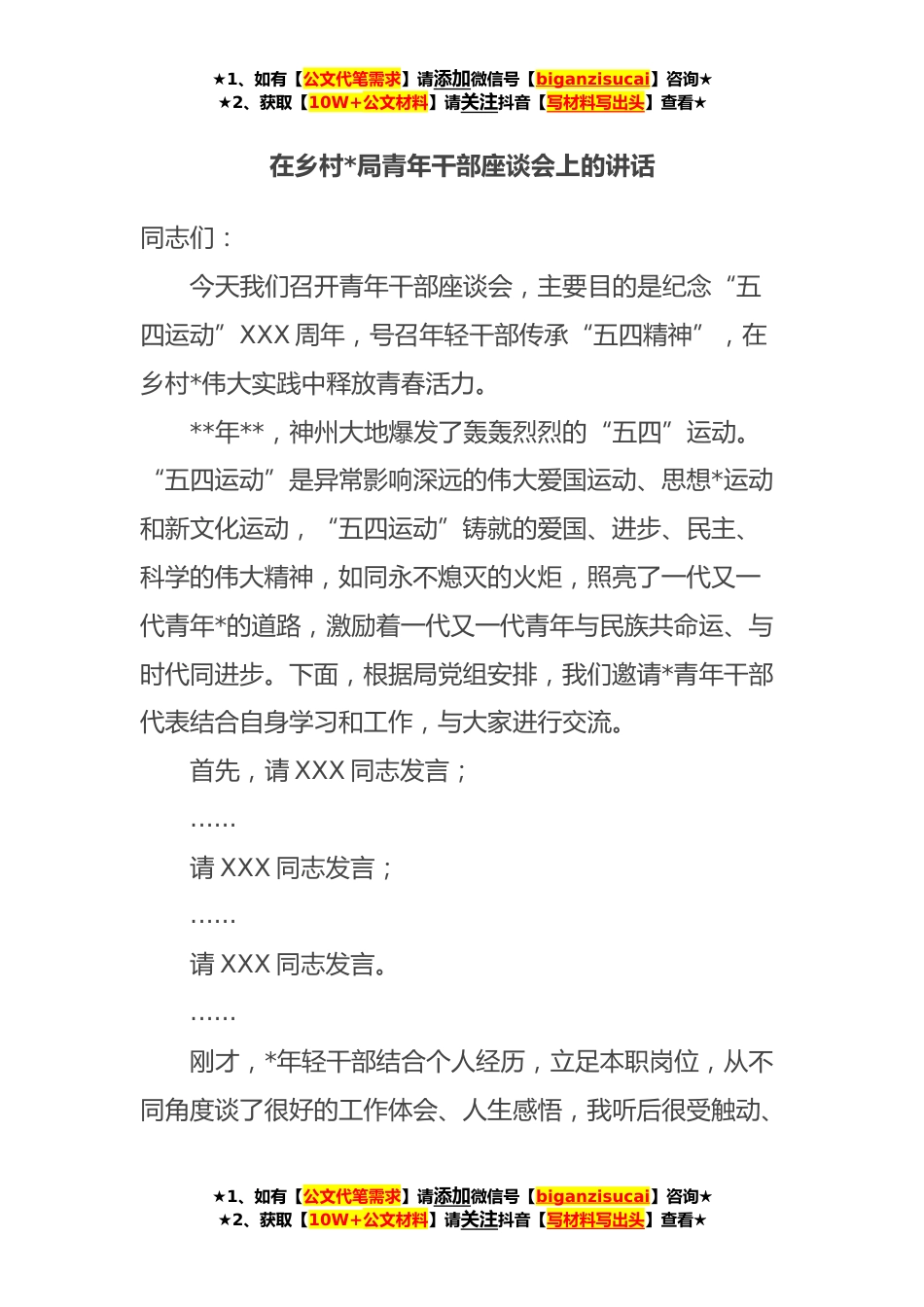 ★1、如有【公文代笔需求】请添加微信号【biganzisucai】咨询★★2、获取【10W+公文材料】请关注抖音【写材料写出头】查看★在乡村*局青年干部座谈会上的讲话同志们:今天我们召开青年干部座谈会,主要目的是纪念“五四运动”XXX周年,号召年轻干部传承“五四精神”,在乡村*伟大实践中释放青春活力。**年**,神州大地爆发了轰轰烈烈的“五四”运动。“五四运动”是异常影响深远的伟大爱国运动、思想*运动和新文化运动,“五四运动”铸就的爱国、进步、民主、科学的伟大精神,如同永不熄灭的火炬,照亮了一代又一代青年*的道路,激励着一代又一代青年与民族共命运、与时代同进步。下面,根据局党组安排,我们邀请*青年干部代表结合自身学习和工作,与大家进行交流。首先,请XXX同志发言;......请XXX同志发言;......