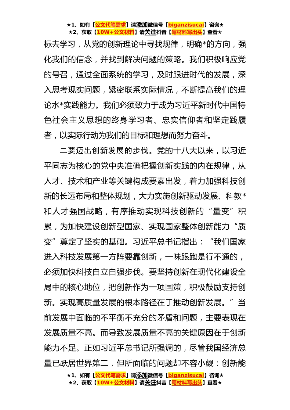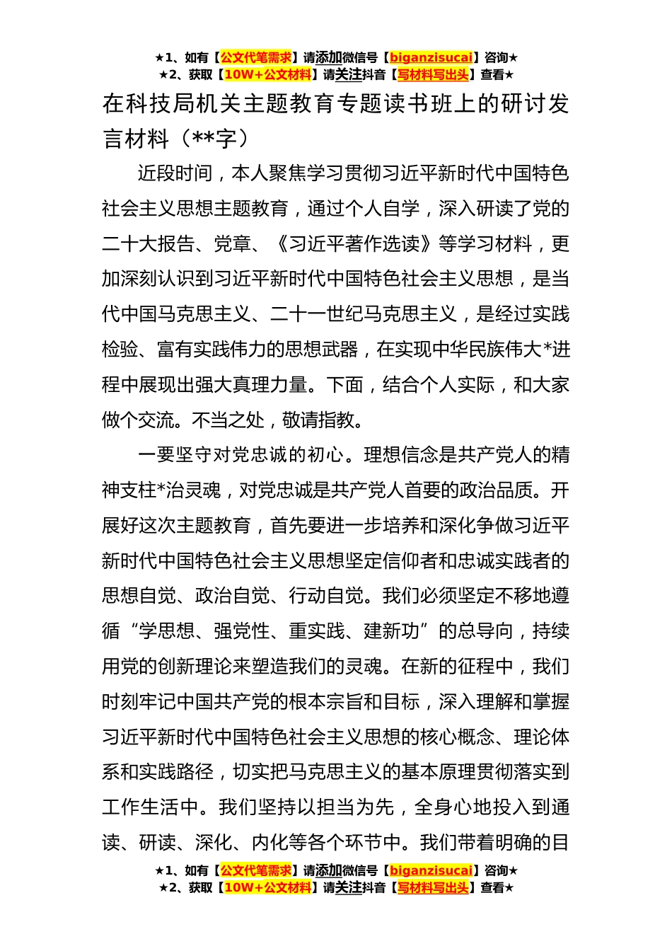 ★1、如有【公文代笔需求】请添加微信号【biganzisucai】咨询★★2、获取【10W+公文材料】请关注抖音【写材料写出头】查看★在科技局机关主题教育专题读书班上的研讨发言材料(**字)近段时间,本人聚焦学习贯彻习近平新时代中国特色社会主义思想主题教育,通过个人自学,深入研读了党的二十大报告、党章、《习近平著作选读》等学习材料,更加深刻认识到习近平新时代中国特色社会主义思想,是当代中国马克思主义、二十一世纪马克思主义,是经过实践检验、富有实践伟力的思想武器,在实现中华民族伟大*进程中展现出强大真理力量。下面,结合个人实际,和大家做个交流。不当之处,敬请指教。一要坚守对党忠诚的初心。理想信念是共产党人的精神支柱*治灵魂,对党忠诚是共产党人首要的政治品质。开展好这次主题教育,...