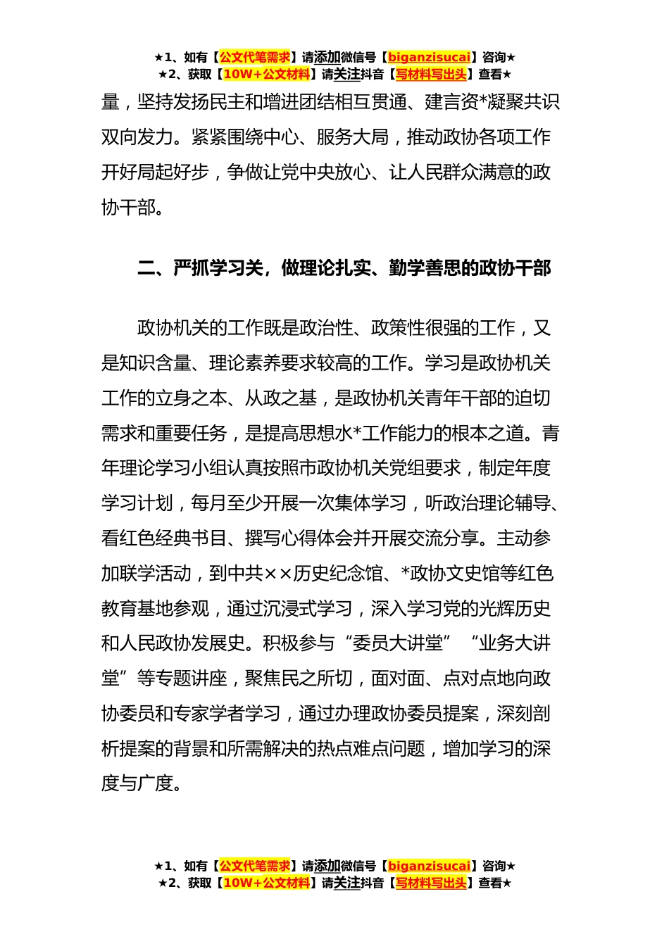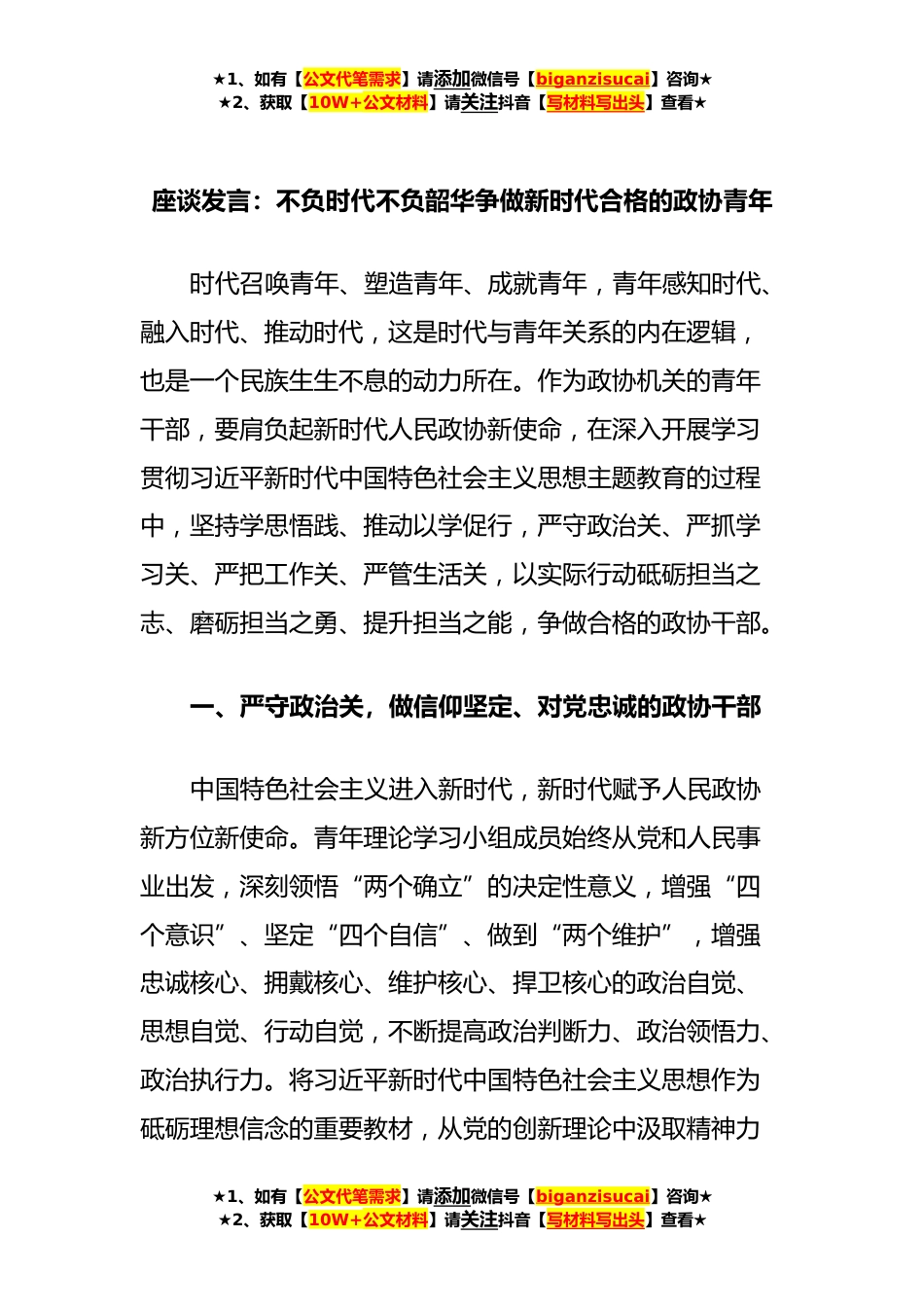 ★1、如有【公文代笔需求】请添加微信号【biganzisucai】咨询★★2、获取【10W+公文材料】请关注抖音【写材料写出头】查看★座谈发言:不负时代不负韶华争做新时代合格的政协青年时代召唤青年、塑造青年、成就青年,青年感知时代、融入时代、推动时代,这是时代与青年关系的内在逻辑,也是一个民族生生不息的动力所在。作为政协机关的青年干部,要肩负起新时代人民政协新使命,在深入开展学习贯彻习近平新时代中国特色社会主义思想主题教育的过程中,坚持学思悟践、推动以学促行,严守政治关、严抓学习关、严把工作关、严管生活关,以实际行动砥砺担当之志、磨砺担当之勇、提升担当之能,争做合格的政协干部。一、严守政治关,做信仰坚定、对党忠诚的政协干部中国特色社会主义进入新时代,新时代赋予人民政协新方...