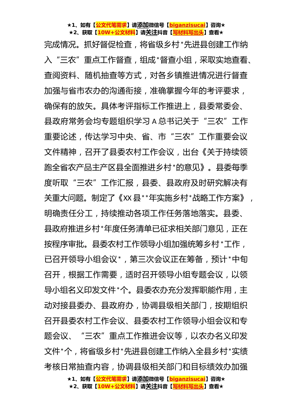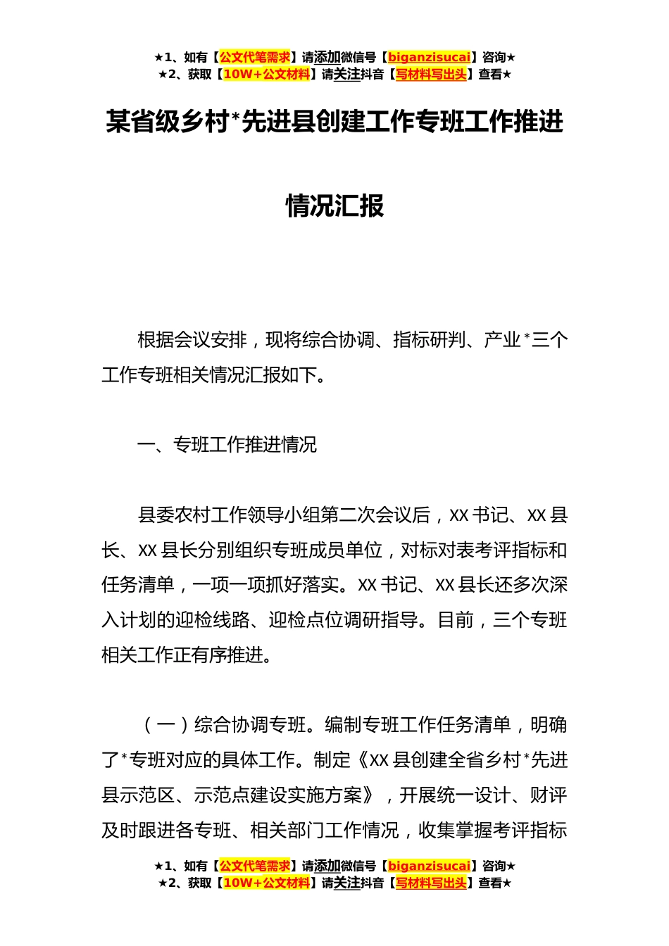 ★1、如有【公文代笔需求】请添加微信号【biganzisucai】咨询★★2、获取【10W+公文材料】请关注抖音【写材料写出头】查看★某省级乡村*先进县创建工作专班工作推进情况汇报根据会议安排,现将综合协调、指标研判、产业*三个工作专班相关情况汇报如下。一、专班工作推进情况县委农村工作领导小组第二次会议后,XX书记、XX县长、XX县长分别组织专班成员单位,对标对表考评指标和任务清单,一项一项抓好落实。XX书记、XX县长还多次深入计划的迎检线路、迎检点位调研指导。目前,三个专班相关工作正有序推进。(一)综合协调专班。编制专班工作任务清单,明确了*专班对应的具体工作。制定《XX县创建全省乡村*先进县示范区、示范点建设实施方案》,开展统一设计、财评及时跟进各专班、相关部门工作情况,收集掌握考评...
