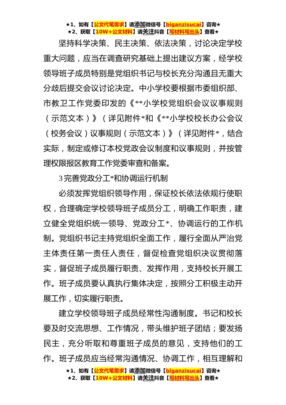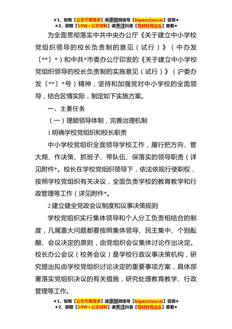★1、如有【公文代笔需求】请添加微信号【biganzisucai】咨询★★2、获取【10W+公文材料】请关注抖音【写材料写出头】查看★为全面贯彻落实中共中央办公厅《关于建立中小学校党组织领导的校长负责制的意见(试行)》(中办发〔**〕*)和中共*市委办公厅印发的《关于建立中小学校党组织领导的校长负责制的实施意见(试行)》(沪委办发〔**〕*号)精神,坚持和加强党对中小学校的全面领导,结合区情实际,制定如下实施方案。一、主要任务(一)理顺领导体制,完善治理机制1明确学校党组织和校长职责中小学校党组织全面领导学校工作,履行把方向、管大局、作决策、抓班子、带队伍、保落实的领导职责(详见附件*。校长在学校党组织领导下,依法依规行使职权,按照学校党组织有关决议,全面负责学校的教育教学和行政管...
