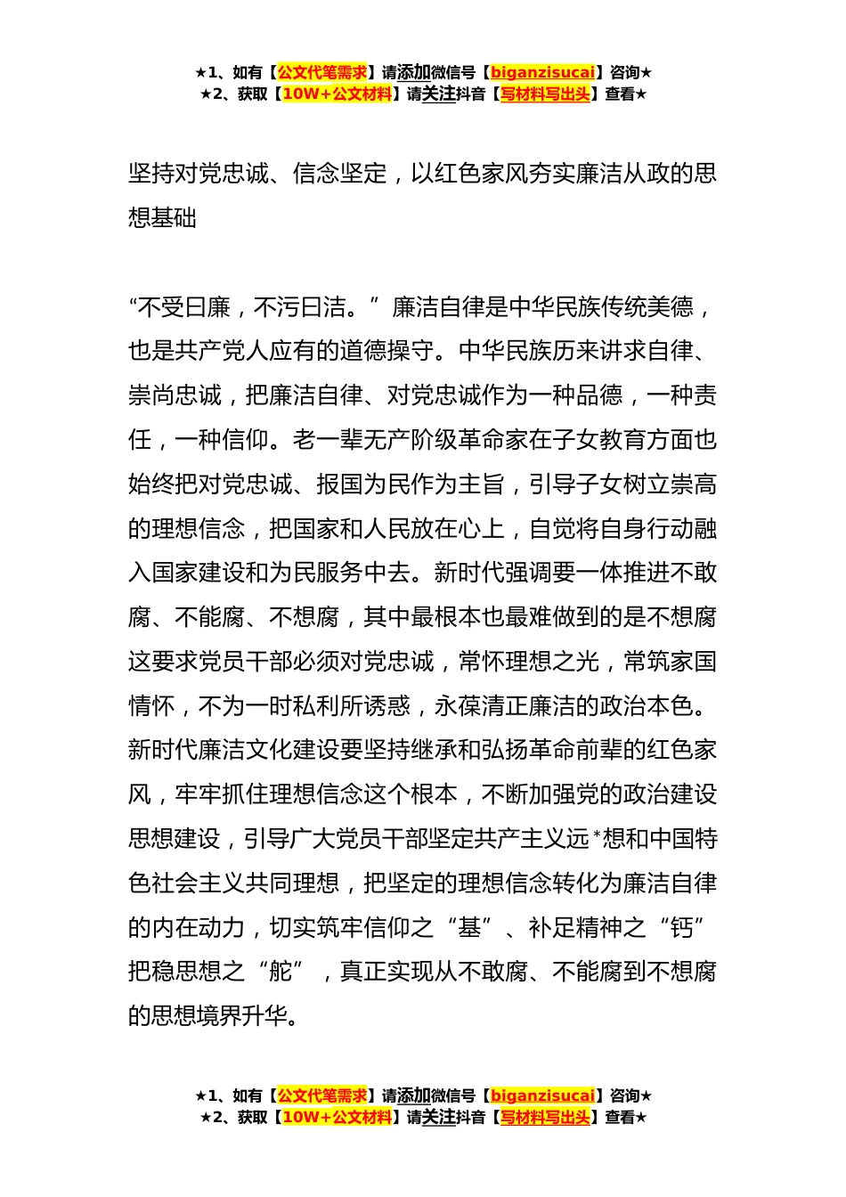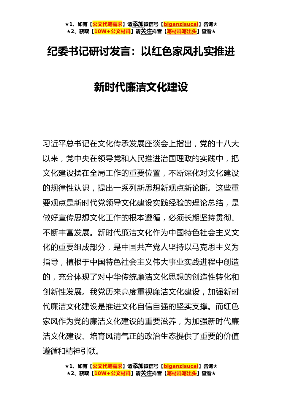 ★1、如有【公文代笔需求】请添加微信号【biganzisucai】咨询★★2、获取【10W+公文材料】请关注抖音【写材料写出头】查看★纪委书记研讨发言:以红色家风扎实推进新时代廉洁文化建设习近平总书记在文化传承发展座谈会上指出,党的十八大以来,党中央在领导党和人民推进治国理政的实践中,把文化建设摆在全局工作的重要位置,不断深化对文化建设的规律性认识,提出一系列新思想新观点新论断。这些重要观点是新时代党领导文化建设实践经验的理论总结,是做好宣传思想文化工作的根本遵循,必须长期坚持贯彻、不断丰富发展。新时代廉洁文化作为中国特色社会主义文化的重要组成部分,是中国共产党人坚持以马克思主义为指导,植根于中国特色社会主义伟大事业实践进程中创造的,充分体现了对中华传统廉洁文化思想的创造...