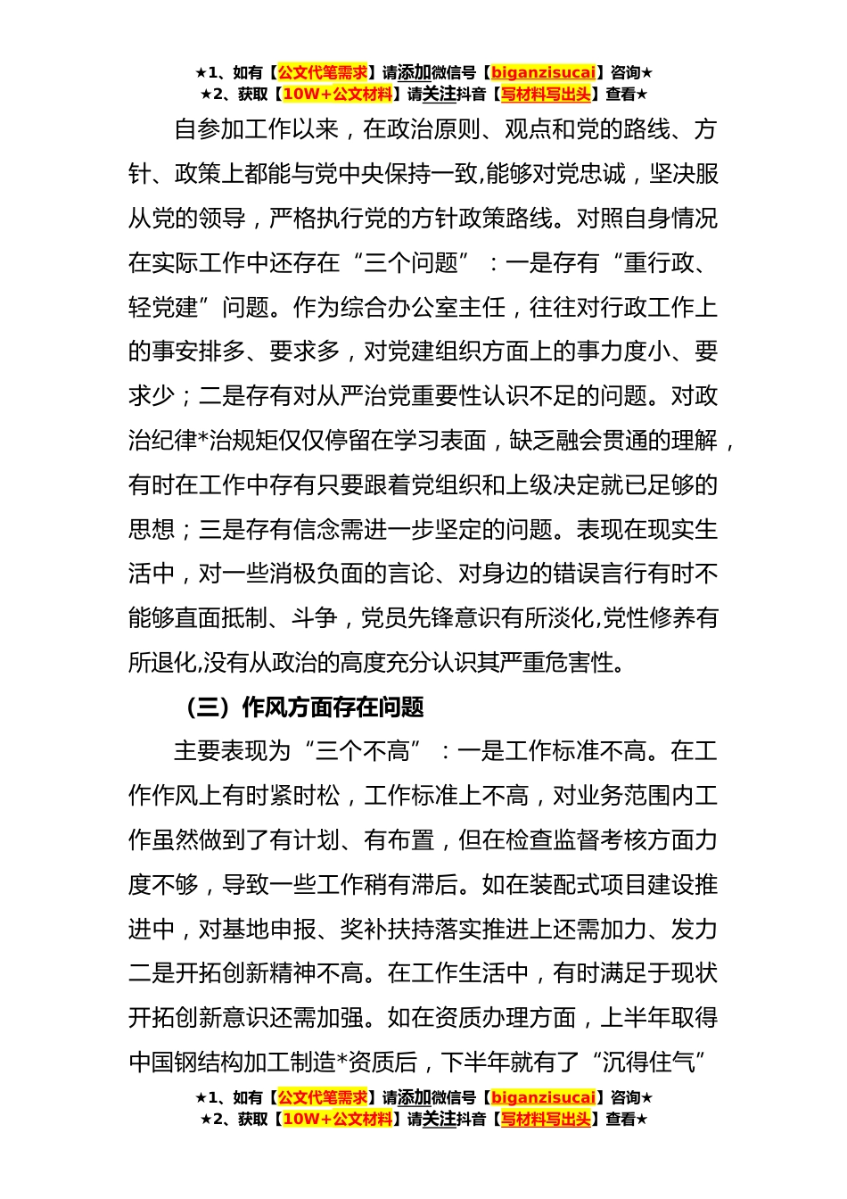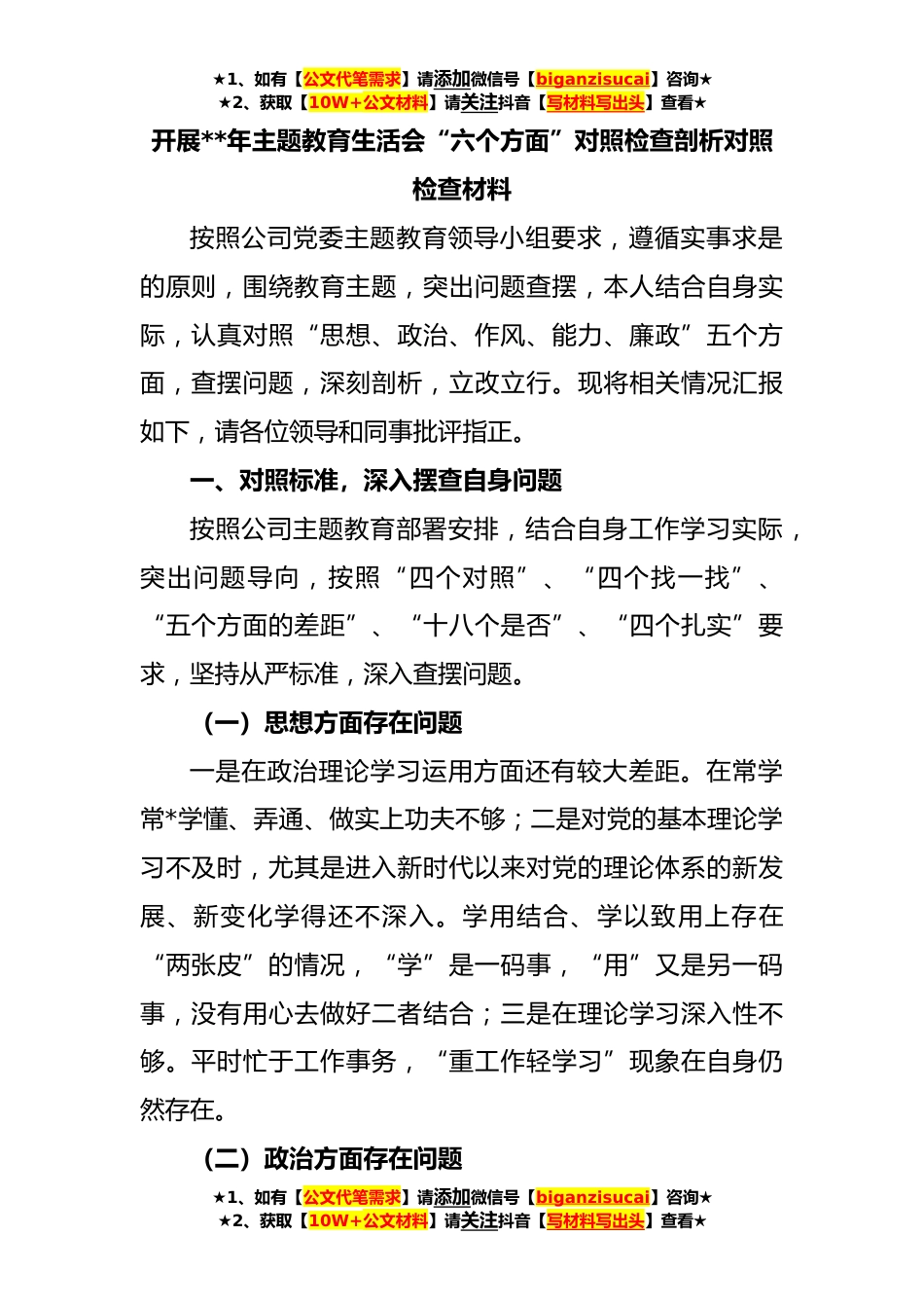 ★1、如有【公文代笔需求】请添加微信号【biganzisucai】咨询★★2、获取【10W+公文材料】请关注抖音【写材料写出头】查看★开展**年主题教育生活会“六个方面”对照检查剖析对照检查材料按照公司党委主题教育领导小组要求,遵循实事求是的原则,围绕教育主题,突出问题查摆,本人结合自身实际,认真对照“思想、政治、作风、能力、廉政”五个方面,查摆问题,深刻剖析,立改立行。现将相关情况汇报如下,请各位领导和同事批评指正。一、对照标准,深入摆查自身问题按照公司主题教育部署安排,结合自身工作学习实际,突出问题导向,按照“四个对照”、“四个找一找”、“五个方面的差距”、“十八个是否”、“四个扎实”要求,坚持从严标准,深入查摆问题。(一)思想方面存在问题一是在政治理论学习运用方面还有...