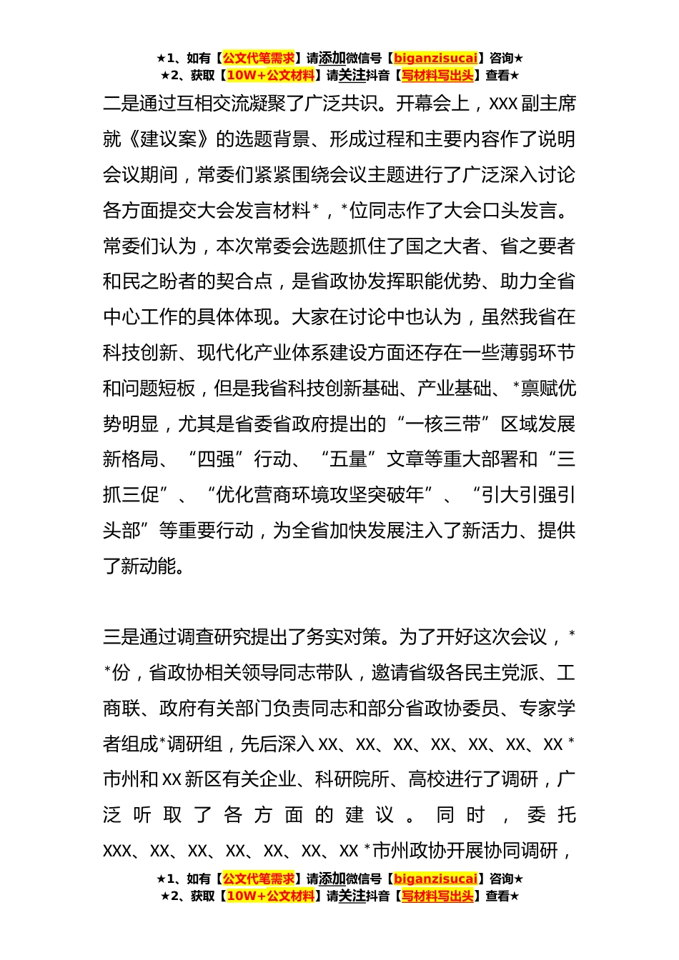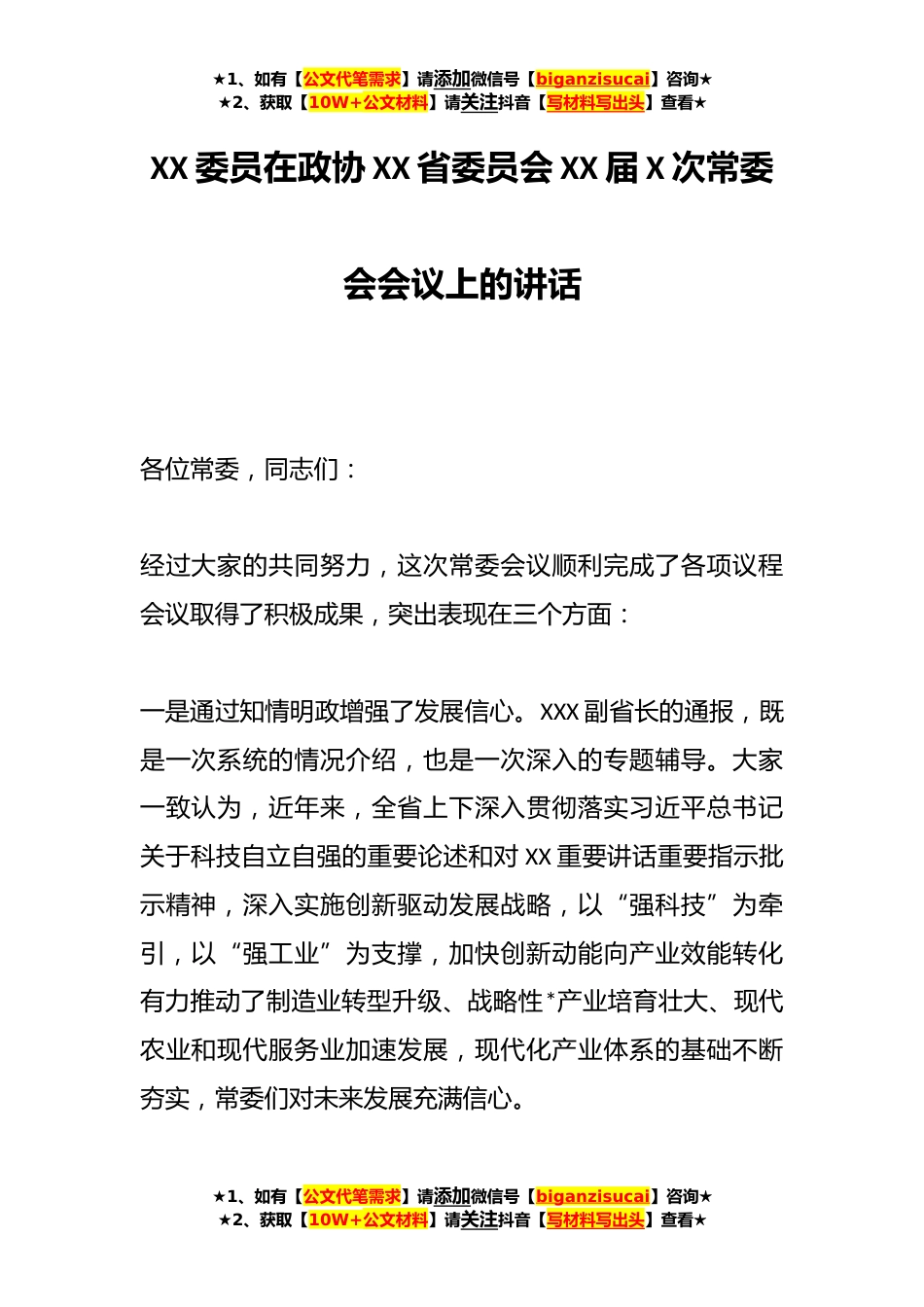 ★1、如有【公文代笔需求】请添加微信号【biganzisucai】咨询★★2、获取【10W+公文材料】请关注抖音【写材料写出头】查看★XX委员在政协XX省委员会XX届X次常委会会议上的讲话各位常委,同志们:经过大家的共同努力,这次常委会议顺利完成了各项议程会议取得了积极成果,突出表现在三个方面:一是通过知情明政增强了发展信心。XXX副省长的通报,既是一次系统的情况介绍,也是一次深入的专题辅导。大家一致认为,近年来,全省上下深入贯彻落实习近平总书记关于科技自立自强的重要论述和对XX重要讲话重要指示批示精神,深入实施创新驱动发展战略,以“强科技”为牵引,以“强工业”为支撑,加快创新动能向产业效能转化有力推动了制造业转型升级、战略性*产业培育壮大、现代农业和现代服务业加速发展,现代化产业体系...
