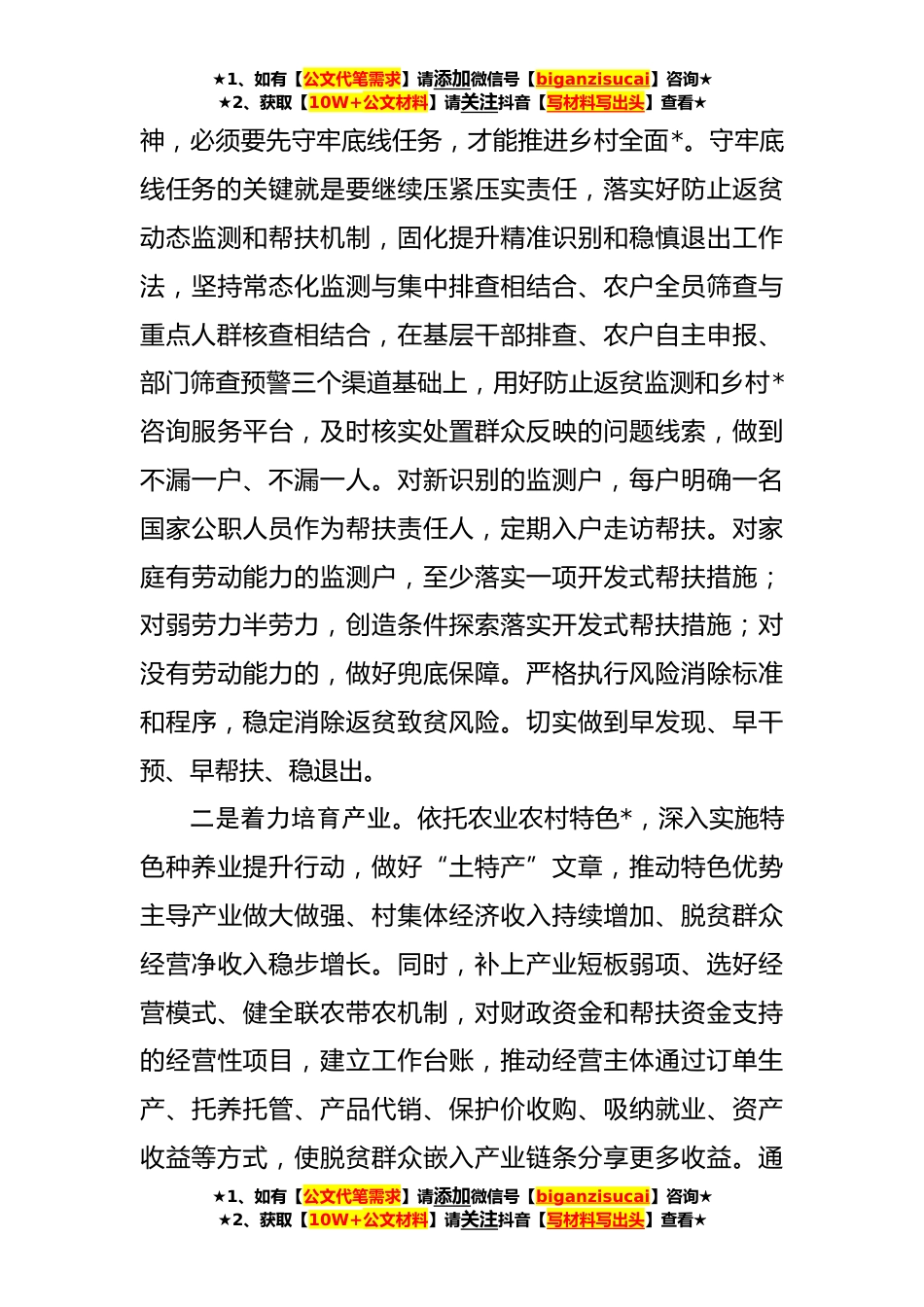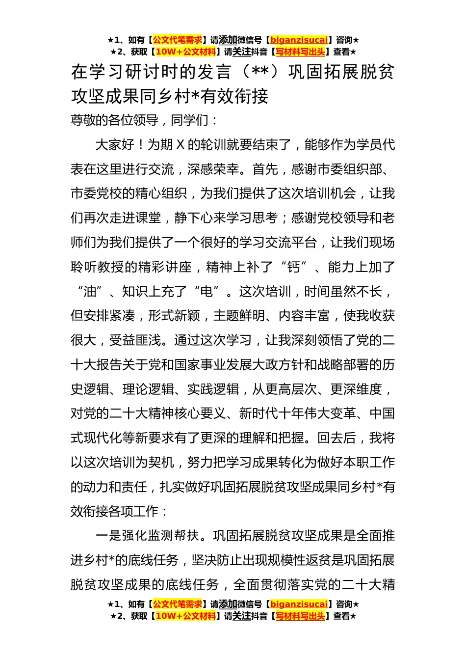 ★1、如有【公文代笔需求】请添加微信号【biganzisucai】咨询★★2、获取【10W+公文材料】请关注抖音【写材料写出头】查看★在学习研讨时的发言(**)巩固拓展脱贫攻坚成果同乡村*有效衔接尊敬的各位领导,同学们:大家好!为期X的轮训就要结束了,能够作为学员代表在这里进行交流,深感荣幸。首先,感谢市委组织部、市委党校的精心组织,为我们提供了这次培训机会,让我们再次走进课堂,静下心来学习思考;感谢党校领导和老师们为我们提供了一个很好的学习交流平台,让我们现场聆听教授的精彩讲座,精神上补了“钙”、能力上加了“油”、知识上充了“电”。这次培训,时间虽然不长,但安排紧凑,形式新颖,主题鲜明、内容丰富,使我收获很大,受益匪浅。通过这次学习,让我深刻领悟了党的二十大报告关于党和国家...