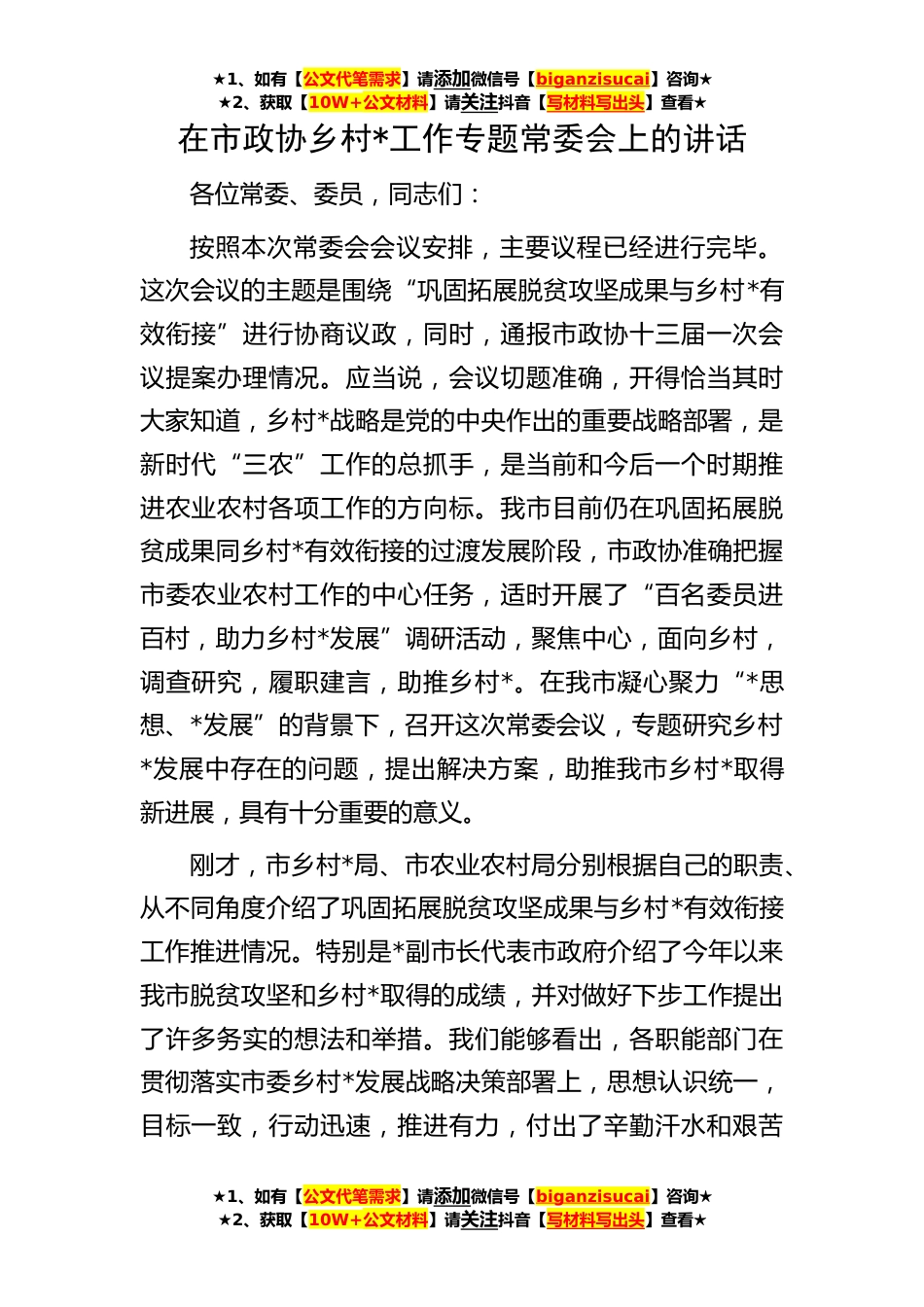 ★1、如有【公文代笔需求】请添加微信号【biganzisucai】咨询★★2、获取【10W+公文材料】请关注抖音【写材料写出头】查看★★1、如有【公文代笔需求】请添加微信号【biganzisucai】咨询★★2、获取【10W+公文材料】请关注抖音【写材料写出头】查看★★1、如有【公文代笔需求】请添加微信号【biganzisucai】咨询★★2、获取【10W+公文材料】请关注抖音【写材料写出头】查看★在市政协乡村*工作专题常委会上的讲话各位常委、委员,同志们:按照本次常委会会议安排,主要议程已经进行完毕。这次会议的主题是围绕“巩固拓展脱贫攻坚成果与乡村*有效衔接”进行协商议政,同时,通报市政协十三届一次会议提案办理情况。应当说,会议切题准确,开得恰当其时大家知道,乡村*战略是党的中央作出的重要战略部署,是新时代“...