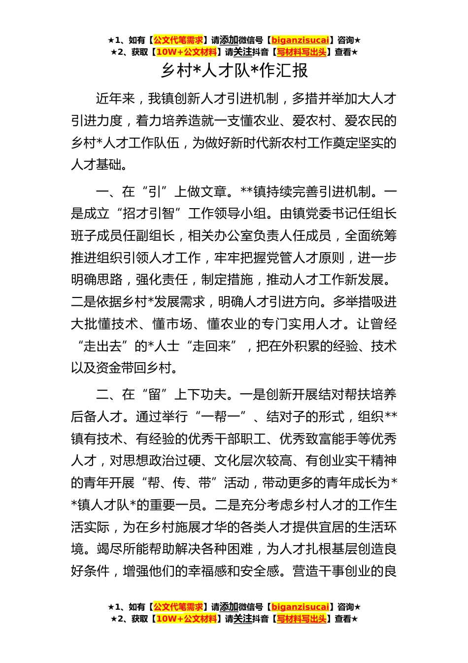 ★1、如有【公文代笔需求】请添加微信号【biganzisucai】咨询★★2、获取【10W+公文材料】请关注抖音【写材料写出头】查看★★1、如有【公文代笔需求】请添加微信号【biganzisucai】咨询★★2、获取【10W+公文材料】请关注抖音【写材料写出头】查看★★1、如有【公文代笔需求】请添加微信号【biganzisucai】咨询★★2、获取【10W+公文材料】请关注抖音【写材料写出头】查看★乡村*人才队*作汇报近年来,我镇创新人才引进机制,多措并举加大人才引进力度,着力培养造就一支懂农业、爱农村、爱农民的乡村*人才工作队伍,为做好新时代新农村工作奠定坚实的人才基础。一、在“引”上做文章。**镇持续完善引进机制。一是成立“招才引智”工作领导小组。由镇党委书记任组长班子成员任副组长,相关办公室负责人任成员,全...