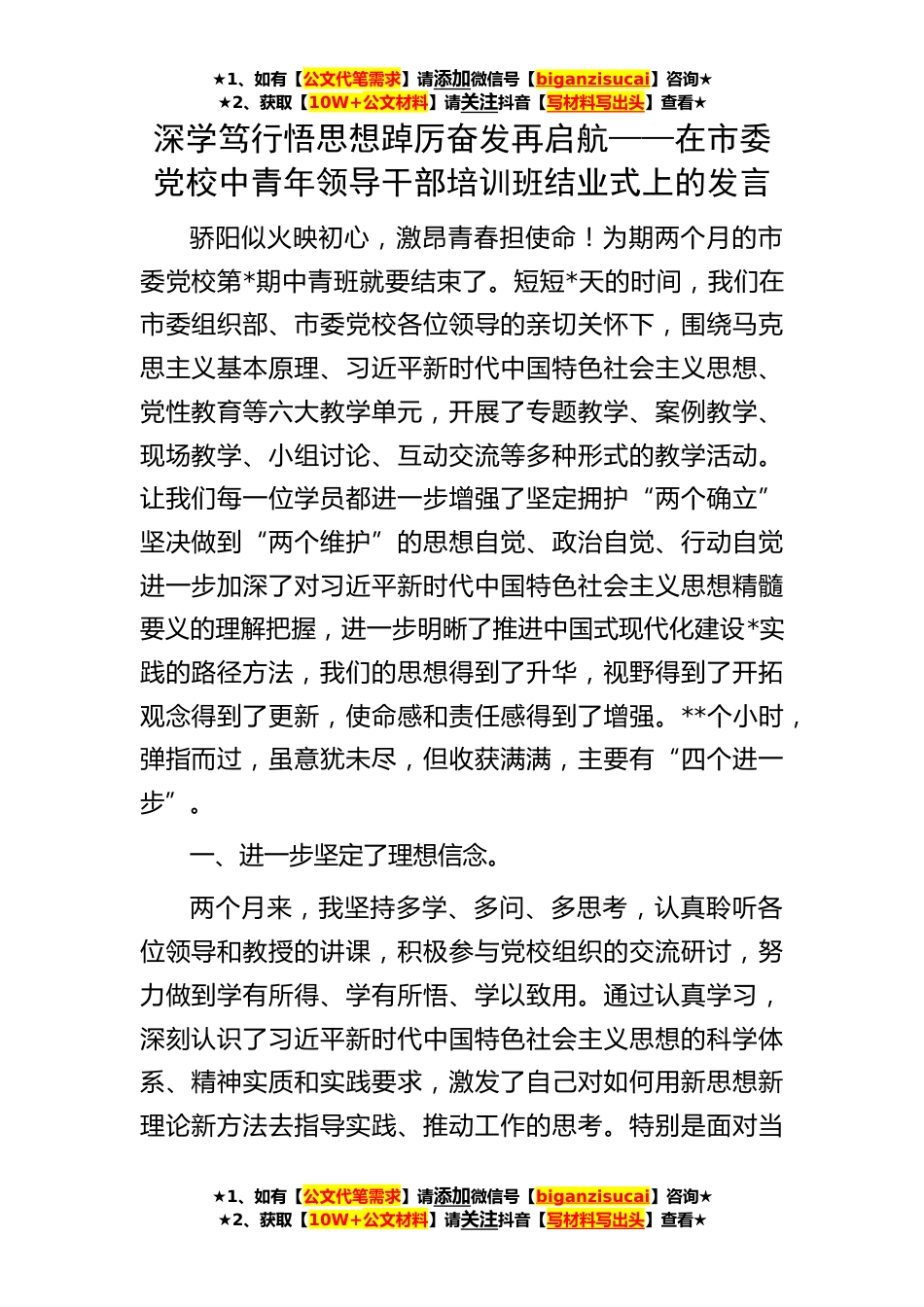 ★1、如有【公文代笔需求】请添加微信号【biganzisucai】咨询★★2、获取【10W+公文材料】请关注抖音【写材料写出头】查看★★1、如有【公文代笔需求】请添加微信号【biganzisucai】咨询★★2、获取【10W+公文材料】请关注抖音【写材料写出头】查看★★1、如有【公文代笔需求】请添加微信号【biganzisucai】咨询★★2、获取【10W+公文材料】请关注抖音【写材料写出头】查看★深学笃行悟思想踔厉奋发再启航——在市委党校中青年领导干部培训班结业式上的发言骄阳似火映初心,激昂青春担使命!为期两个月的市委党校第*期中青班就要结束了。短短*天的时间,我们在市委组织部、市委党校各位领导的亲切关怀下,围绕马克思主义基本原理、习近平新时代中国特色社会主义思想、党性教育等六大教学单元,开展了专题教学、案...