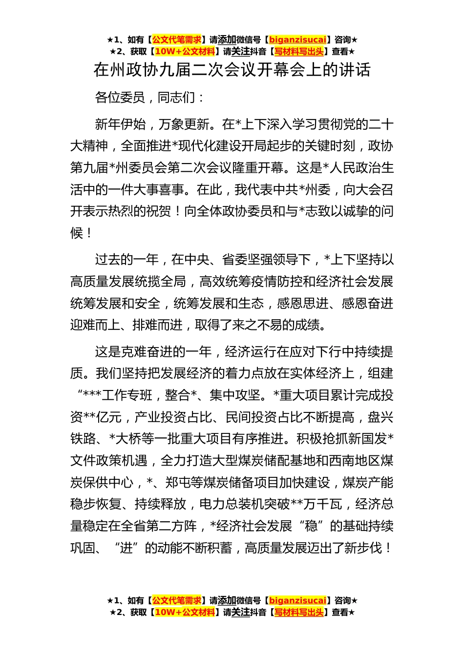 ★1、如有【公文代笔需求】请添加微信号【biganzisucai】咨询★★2、获取【10W+公文材料】请关注抖音【写材料写出头】查看★★1、如有【公文代笔需求】请添加微信号【biganzisucai】咨询★★2、获取【10W+公文材料】请关注抖音【写材料写出头】查看★★1、如有【公文代笔需求】请添加微信号【biganzisucai】咨询★★2、获取【10W+公文材料】请关注抖音【写材料写出头】查看★在州政协九届二次会议开幕会上的讲话各位委员,同志们:新年伊始,万象更新。在*上下深入学习贯彻党的二十大精神,全面推进*现代化建设开局起步的关键时刻,政协第九届*州委员会第二次会议隆重开幕。这是*人民政治生活中的一件大事喜事。在此,我代表中共*州委,向大会召开表示热烈的祝贺!向全体政协委员和与*志致以诚挚的问候!过去的一...