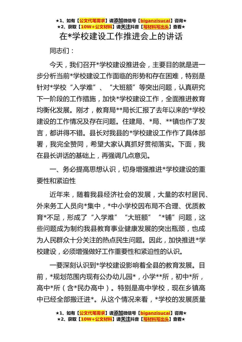 ★1、如有【公文代笔需求】请添加微信号【biganzisucai】咨询★★2、获取【10W+公文材料】请关注抖音【写材料写出头】查看★★1、如有【公文代笔需求】请添加微信号【biganzisucai】咨询★★2、获取【10W+公文材料】请关注抖音【写材料写出头】查看★★1、如有【公文代笔需求】请添加微信号【biganzisucai】咨询★★2、获取【10W+公文材料】请关注抖音【写材料写出头】查看★在*学校建设工作推进会上的讲话同志们:今天,我们召开*学校建设推进会,主要目的就是进一步分析当前*学校建设工作面临的形势和存在困难,特别是针对*学校“入学难”、“大班额”等突出问题,认真研究下一阶段的工作措施,加快*学校建设工作,全面推进教育均衡化发展。刚才,教育局**局长汇报了去年以来的*学校建设的工作情况及存在问题。...