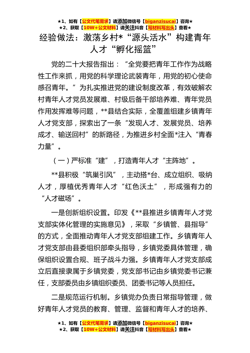 ★1、如有【公文代笔需求】请添加微信号【biganzisucai】咨询★★2、获取【10W+公文材料】请关注抖音【写材料写出头】查看★★1、如有【公文代笔需求】请添加微信号【biganzisucai】咨询★★2、获取【10W+公文材料】请关注抖音【写材料写出头】查看★★1、如有【公文代笔需求】请添加微信号【biganzisucai】咨询★★2、获取【10W+公文材料】请关注抖音【写材料写出头】查看★经验做法:激荡乡村*“源头活水”构建青年人才“孵化摇篮”党的二十大报告指出:“全党要把青年工作作为战略性工作来抓,用党的科学理论武装青年,用党的初心使命感召青年。”为扎实推进党的建设制度改革,有效破解农村青年人才党员发展难、村级后备干部培养难、青年党员作用发挥难等问题,**县结合实际,全覆盖组建乡镇青年人才党支部,探...