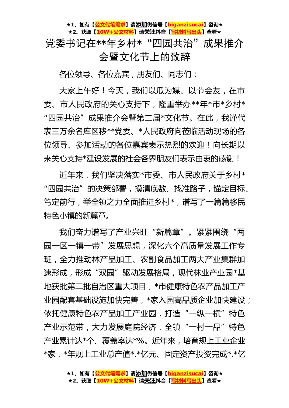 ★1、如有【公文代笔需求】请添加微信号【biganzisucai】咨询★★2、获取【10W+公文材料】请关注抖音【写材料写出头】查看★★1、如有【公文代笔需求】请添加微信号【biganzisucai】咨询★★2、获取【10W+公文材料】请关注抖音【写材料写出头】查看★★1、如有【公文代笔需求】请添加微信号【biganzisucai】咨询★★2、获取【10W+公文材料】请关注抖音【写材料写出头】查看★党委书记在**年乡村*“四园共治”成果推介会暨文化节上的致辞各位领导、各位嘉宾,朋友们、同志们:大家上午好!今天,我们以瓜为媒、以节会友,在市委、市人民政府的关心支持下,隆重举办**年*市*乡村*“四园共治”成果推介会暨第二届*文化节。在此,我谨代表三万余名库区移**党委、*人民政府向莅临活动现场的各位领导、参加活动的各位嘉...