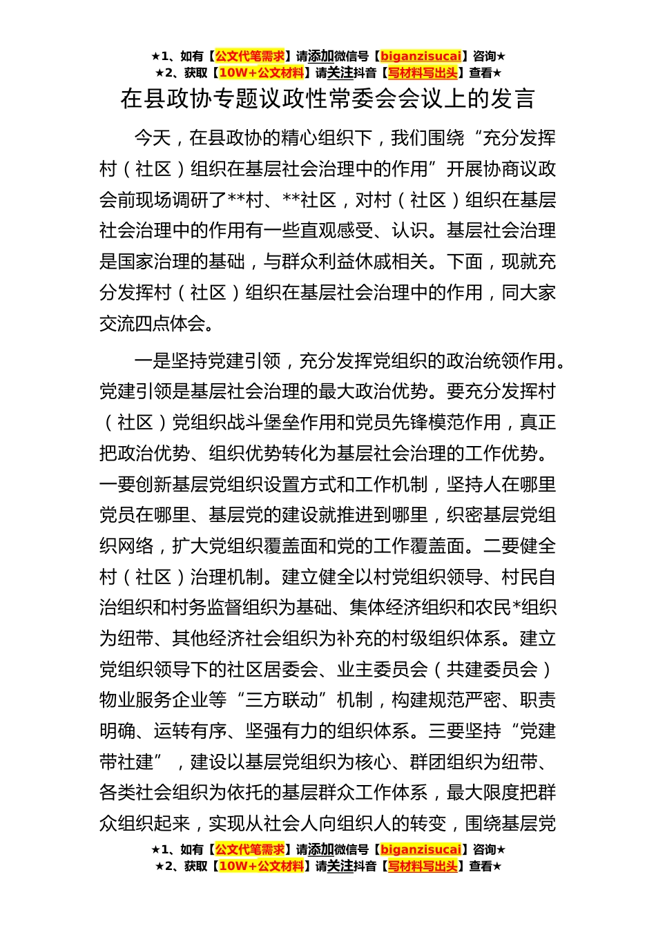 ★1、如有【公文代笔需求】请添加微信号【biganzisucai】咨询★★2、获取【10W+公文材料】请关注抖音【写材料写出头】查看★★1、如有【公文代笔需求】请添加微信号【biganzisucai】咨询★★2、获取【10W+公文材料】请关注抖音【写材料写出头】查看★★1、如有【公文代笔需求】请添加微信号【biganzisucai】咨询★★2、获取【10W+公文材料】请关注抖音【写材料写出头】查看★在县政协专题议政性常委会会议上的发言今天,在县政协的精心组织下,我们围绕“充分发挥村(社区)组织在基层社会治理中的作用”开展协商议政会前现场调研了**村、**社区,对村(社区)组织在基层社会治理中的作用有一些直观感受、认识。基层社会治理是国家治理的基础,与群众利益休戚相关。下面,现就充分发挥村(社区)组织在基层社会治...
