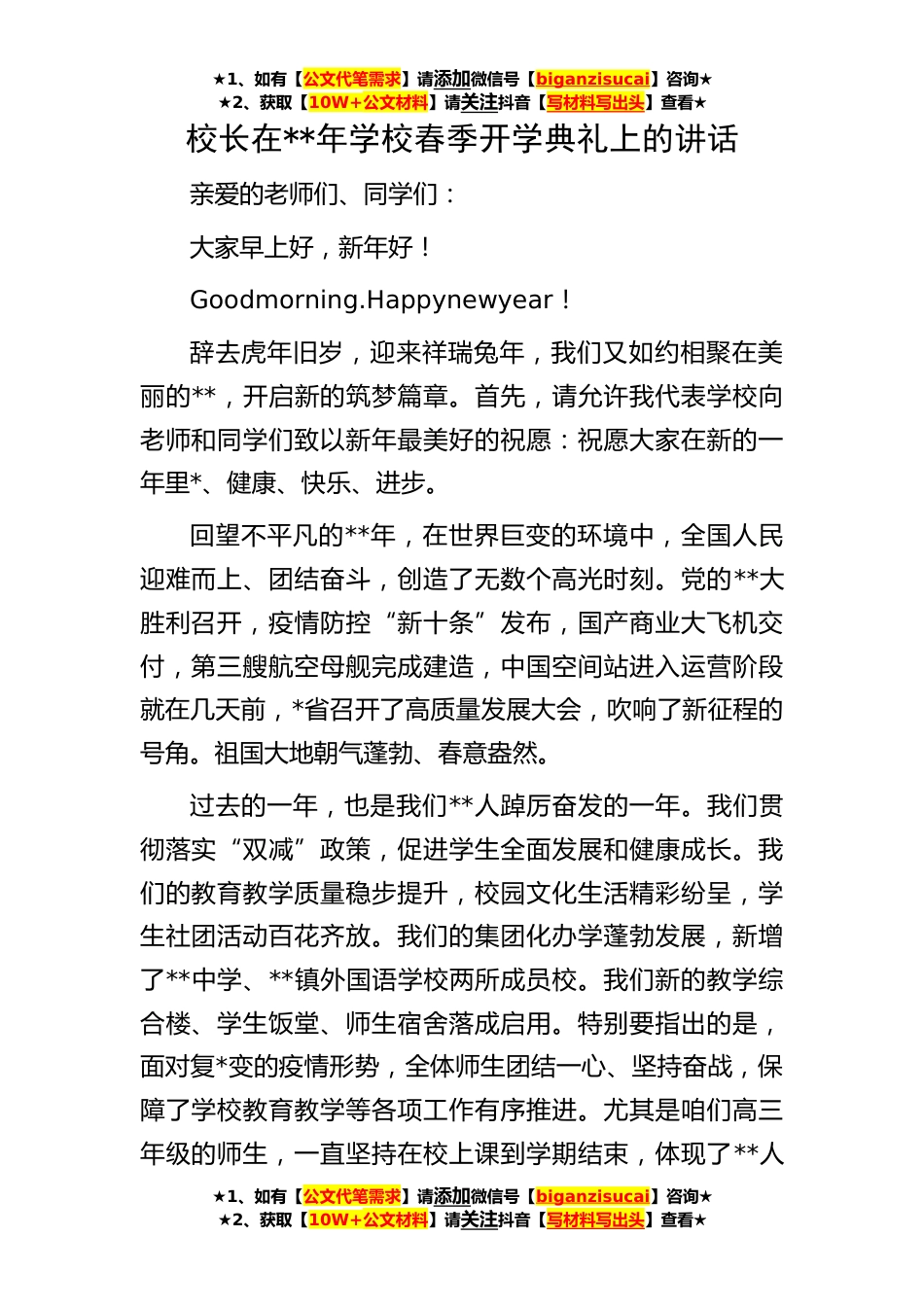 ★1、如有【公文代笔需求】请添加微信号【biganzisucai】咨询★★2、获取【10W+公文材料】请关注抖音【写材料写出头】查看★★1、如有【公文代笔需求】请添加微信号【biganzisucai】咨询★★2、获取【10W+公文材料】请关注抖音【写材料写出头】查看★★1、如有【公文代笔需求】请添加微信号【biganzisucai】咨询★★2、获取【10W+公文材料】请关注抖音【写材料写出头】查看★校长在**年学校春季开学典礼上的讲话亲爱的老师们、同学们:大家早上好,新年好!Goodmorning.Happynewyear!辞去虎年旧岁,迎来祥瑞兔年,我们又如约相聚在美丽的**,开启新的筑梦篇章。首先,请允许我代表学校向老师和同学们致以新年最美好的祝愿:祝愿大家在新的一年里*、健康、快乐、进步。回望不平凡的**年,在世界巨变的环境中,全国...