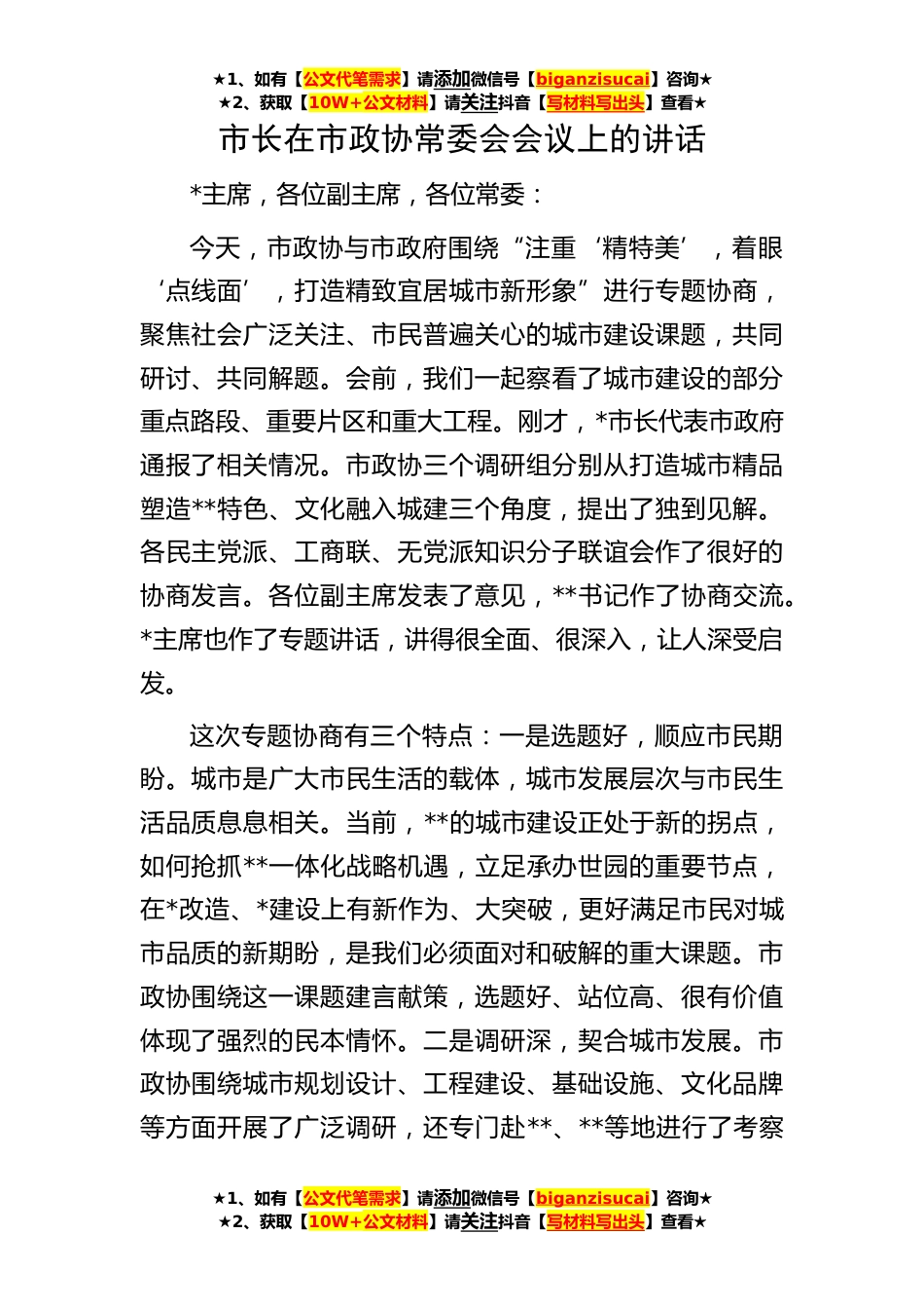 ★1、如有【公文代笔需求】请添加微信号【biganzisucai】咨询★★2、获取【10W+公文材料】请关注抖音【写材料写出头】查看★★1、如有【公文代笔需求】请添加微信号【biganzisucai】咨询★★2、获取【10W+公文材料】请关注抖音【写材料写出头】查看★★1、如有【公文代笔需求】请添加微信号【biganzisucai】咨询★★2、获取【10W+公文材料】请关注抖音【写材料写出头】查看★市长在市政协常委会会议上的讲话*主席,各位副主席,各位常委:今天,市政协与市政府围绕“注重‘精特美’,着眼‘点线面’,打造精致宜居城市新形象”进行专题协商,聚焦社会广泛关注、市民普遍关心的城市建设课题,共同研讨、共同解题。会前,我们一起察看了城市建设的部分重点路段、重要片区和重大工程。刚才,*市长代表市政府通报了相...