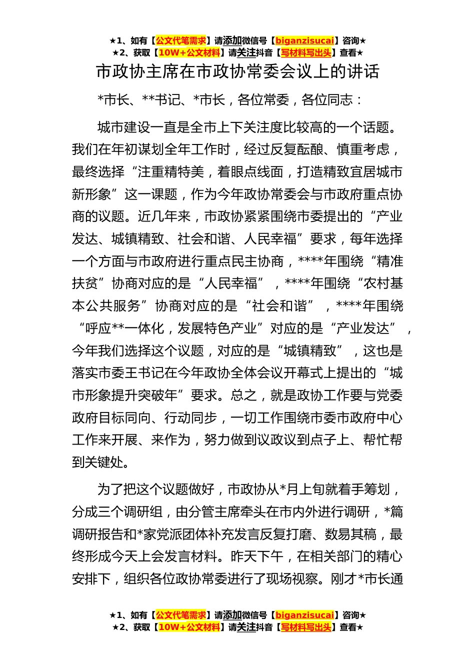 ★1、如有【公文代笔需求】请添加微信号【biganzisucai】咨询★★2、获取【10W+公文材料】请关注抖音【写材料写出头】查看★★1、如有【公文代笔需求】请添加微信号【biganzisucai】咨询★★2、获取【10W+公文材料】请关注抖音【写材料写出头】查看★★1、如有【公文代笔需求】请添加微信号【biganzisucai】咨询★★2、获取【10W+公文材料】请关注抖音【写材料写出头】查看★市政协主席在市政协常委会议上的讲话*市长、**书记、*市长,各位常委,各位同志:城市建设一直是全市上下关注度比较高的一个话题。我们在年初谋划全年工作时,经过反复酝酿、慎重考虑,最终选择“注重精特美,着眼点线面,打造精致宜居城市新形象”这一课题,作为今年政协常委会与市政府重点协商的议题。近几年来,市政协紧紧围绕市委提出...