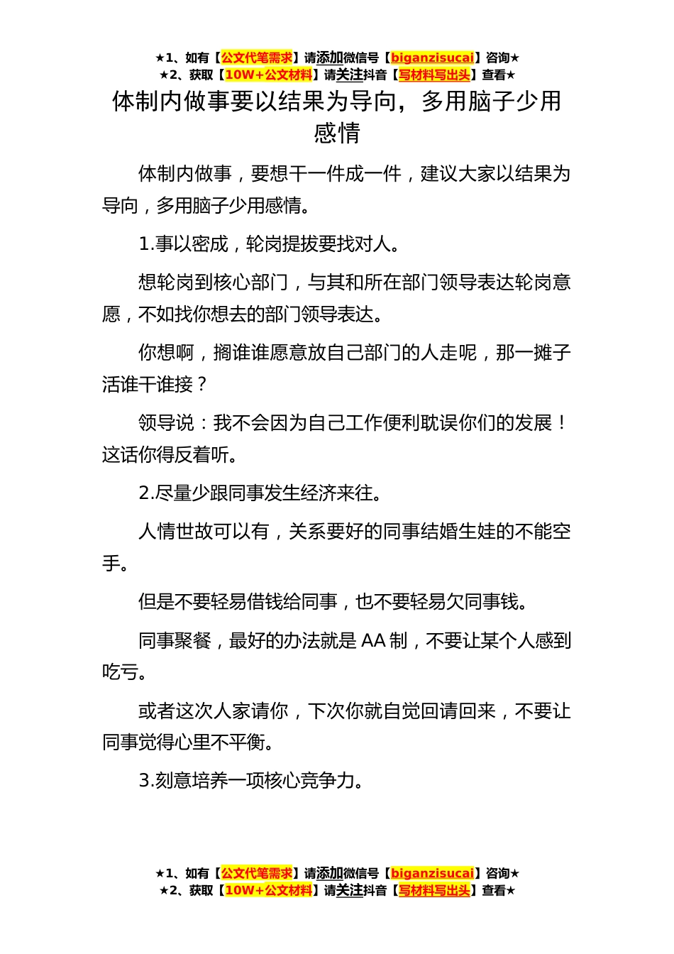 ★1、如有【公文代笔需求】请添加微信号【biganzisucai】咨询★★2、获取【10W+公文材料】请关注抖音【写材料写出头】查看★★1、如有【公文代笔需求】请添加微信号【biganzisucai】咨询★★2、获取【10W+公文材料】请关注抖音【写材料写出头】查看★★1、如有【公文代笔需求】请添加微信号【biganzisucai】咨询★★2、获取【10W+公文材料】请关注抖音【写材料写出头】查看★体制内做事要以结果为导向,多用脑子少用感情体制内做事,要想干一件成一件,建议大家以结果为导向,多用脑子少用感情。1.事以密成,轮岗提拔要找对人。想轮岗到核心部门,与其和所在部门领导表达轮岗意愿,不如找你想去的部门领导表达。你想啊,搁谁谁愿意放自己部门的人走呢,那一摊子活谁干谁接?领导说:我不会因为自己工作便利耽误你...