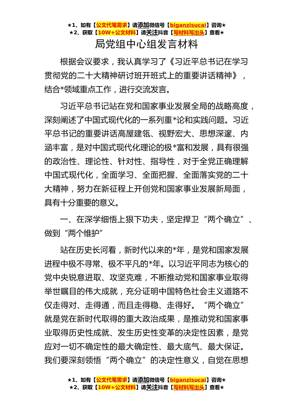 ★1、如有【公文代笔需求】请添加微信号【biganzisucai】咨询★★2、获取【10W+公文材料】请关注抖音【写材料写出头】查看★★1、如有【公文代笔需求】请添加微信号【biganzisucai】咨询★★2、获取【10W+公文材料】请关注抖音【写材料写出头】查看★★1、如有【公文代笔需求】请添加微信号【biganzisucai】咨询★★2、获取【10W+公文材料】请关注抖音【写材料写出头】查看★局党组中心组发言材料根据会议要求,我认真学习了《习近平总书记在学习贯彻党的二十大精神研讨班开班式上的重要讲话精神》,结合*领域重点工作,进行交流发言。习近平总书记站在党和国家事业发展全局的战略高度,深刻阐述了中国式现代化的一系列重*论和实践问题。习近平总书记的重要讲话高屋建瓴、视野宏大、思想深邃、内涵丰富,是对中国...