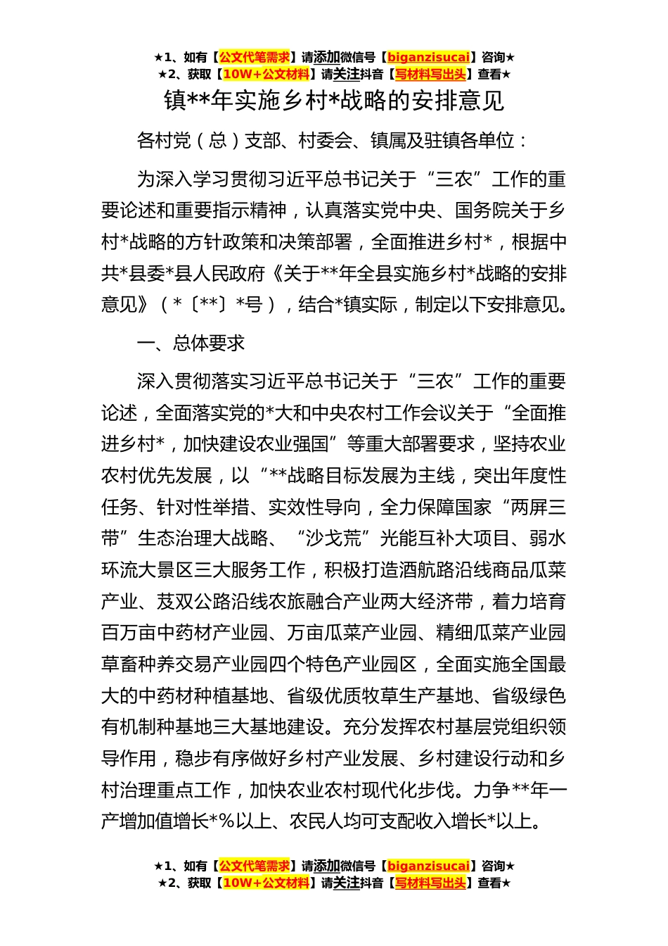 ★1、如有【公文代笔需求】请添加微信号【biganzisucai】咨询★★2、获取【10W+公文材料】请关注抖音【写材料写出头】查看★★1、如有【公文代笔需求】请添加微信号【biganzisucai】咨询★★2、获取【10W+公文材料】请关注抖音【写材料写出头】查看★★1、如有【公文代笔需求】请添加微信号【biganzisucai】咨询★★2、获取【10W+公文材料】请关注抖音【写材料写出头】查看★镇**年实施乡村*战略的安排意见各村党(总)支部、村委会、镇属及驻镇各单位:为深入学习贯彻习近平总书记关于“三农”工作的重要论述和重要指示精神,认真落实党中央、国务院关于乡村*战略的方针政策和决策部署,全面推进乡村*,根据中共*县委*县人民政府《关于**年全县实施乡村*战略的安排意见》(*〔**〕*号),结合*镇实际,制定以下安...