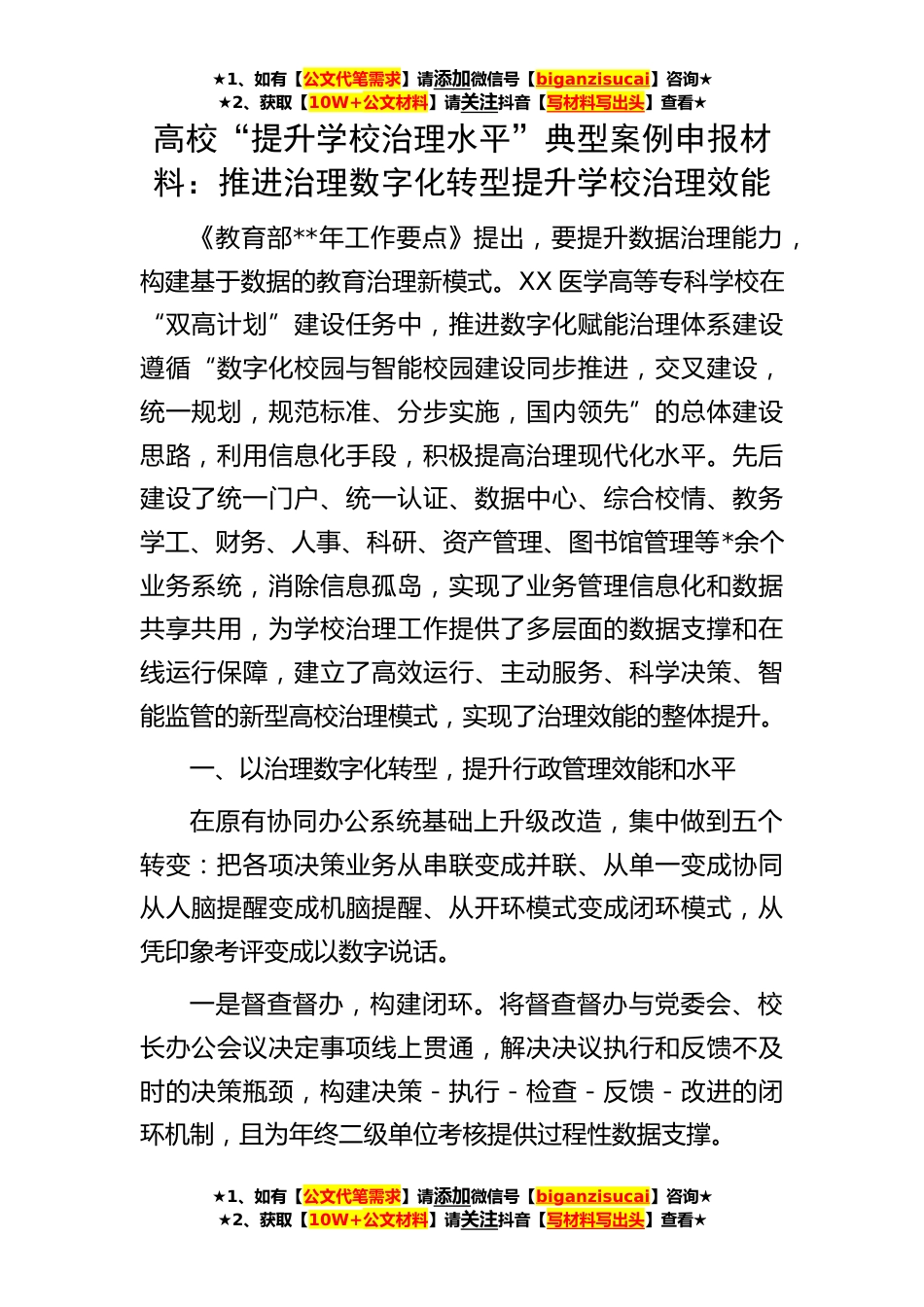 ★1、如有【公文代笔需求】请添加微信号【biganzisucai】咨询★★2、获取【10W+公文材料】请关注抖音【写材料写出头】查看★★1、如有【公文代笔需求】请添加微信号【biganzisucai】咨询★★2、获取【10W+公文材料】请关注抖音【写材料写出头】查看★★1、如有【公文代笔需求】请添加微信号【biganzisucai】咨询★★2、获取【10W+公文材料】请关注抖音【写材料写出头】查看★高校“提升学校治理水平”典型案例申报材料:推进治理数字化转型提升学校治理效能《教育部**年工作要点》提出,要提升数据治理能力,构建基于数据的教育治理新模式。XX医学高等专科学校在“双高计划”建设任务中,推进数字化赋能治理体系建设遵循“数字化校园与智能校园建设同步推进,交叉建设,统一规划,规范标准、分步实施,国内领先”...