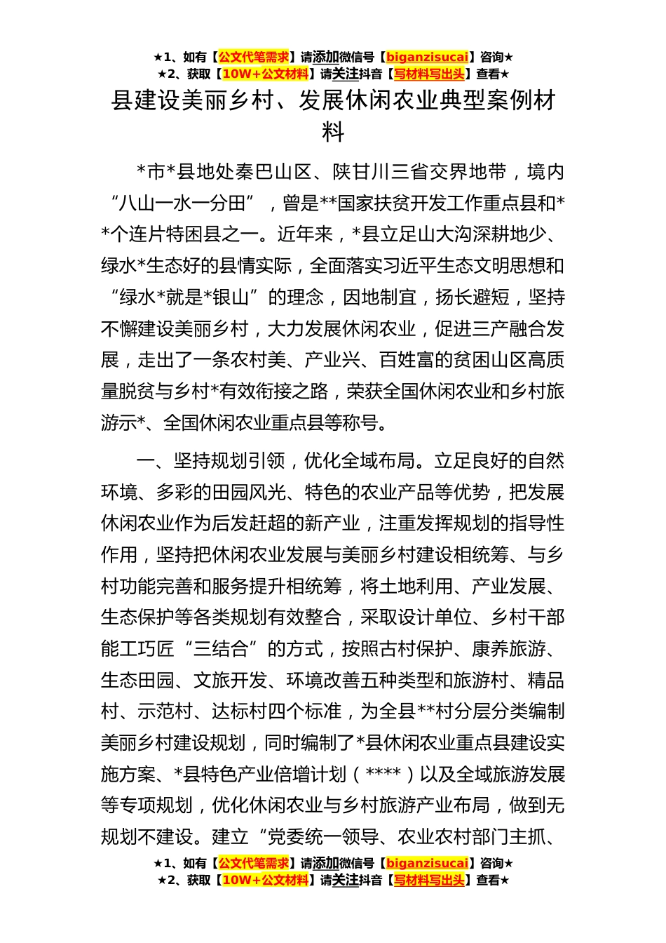 ★1、如有【公文代笔需求】请添加微信号【biganzisucai】咨询★★2、获取【10W+公文材料】请关注抖音【写材料写出头】查看★★1、如有【公文代笔需求】请添加微信号【biganzisucai】咨询★★2、获取【10W+公文材料】请关注抖音【写材料写出头】查看★★1、如有【公文代笔需求】请添加微信号【biganzisucai】咨询★★2、获取【10W+公文材料】请关注抖音【写材料写出头】查看★县建设美丽乡村、发展休闲农业典型案例材料*市*县地处秦巴山区、陕甘川三省交界地带,境内“八山一水一分田”,曾是**国家扶贫开发工作重点县和**个连片特困县之一。近年来,*县立足山大沟深耕地少、绿水*生态好的县情实际,全面落实习近平生态文明思想和“绿水*就是*银山”的理念,因地制宜,扬长避短,坚持不懈建设美丽乡村,大力发展休...