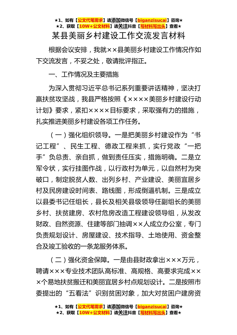 ★1、如有【公文代笔需求】请添加微信号【biganzisucai】咨询★★2、获取【10W+公文材料】请关注抖音【写材料写出头】查看★★1、如有【公文代笔需求】请添加微信号【biganzisucai】咨询★★2、获取【10W+公文材料】请关注抖音【写材料写出头】查看★★1、如有【公文代笔需求】请添加微信号【biganzisucai】咨询★★2、获取【10W+公文材料】请关注抖音【写材料写出头】查看★某县美丽乡村建设工作交流发言材料根据会议安排,我就××县美丽乡村建设工作情况作如下交流发言,不妥之处,敬请批评指正。一、工作情况及主要措施为深入贯彻习近平总书记系列重要讲话精神,坚决打赢扶贫攻坚战,我县严格按照《××××美丽乡村建设行动计划》要求,紧扣××××目标要求,采取强有力的措施,扎实推进美丽乡村建设各项工...