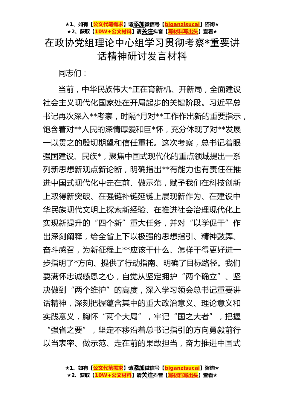 ★1、如有【公文代笔需求】请添加微信号【biganzisucai】咨询★★2、获取【10W+公文材料】请关注抖音【写材料写出头】查看★★1、如有【公文代笔需求】请添加微信号【biganzisucai】咨询★★2、获取【10W+公文材料】请关注抖音【写材料写出头】查看★★1、如有【公文代笔需求】请添加微信号【biganzisucai】咨询★★2、获取【10W+公文材料】请关注抖音【写材料写出头】查看★在政协党组理论中心组学习贯彻考察*重要讲话精神研讨发言材料同志们:当前,中华民族伟大*正在育新机、开新局,全面建设社会主义现代化国家处在开局起步的关键阶段。习近平总书记再次深入**考察,时隔*月对**工作作出新的重要指示,饱含着对**人民的深情厚爱和巨*怀,充分体现了对**发展一以贯之的殷切期望和信任重托。这次考察,总书记着...
