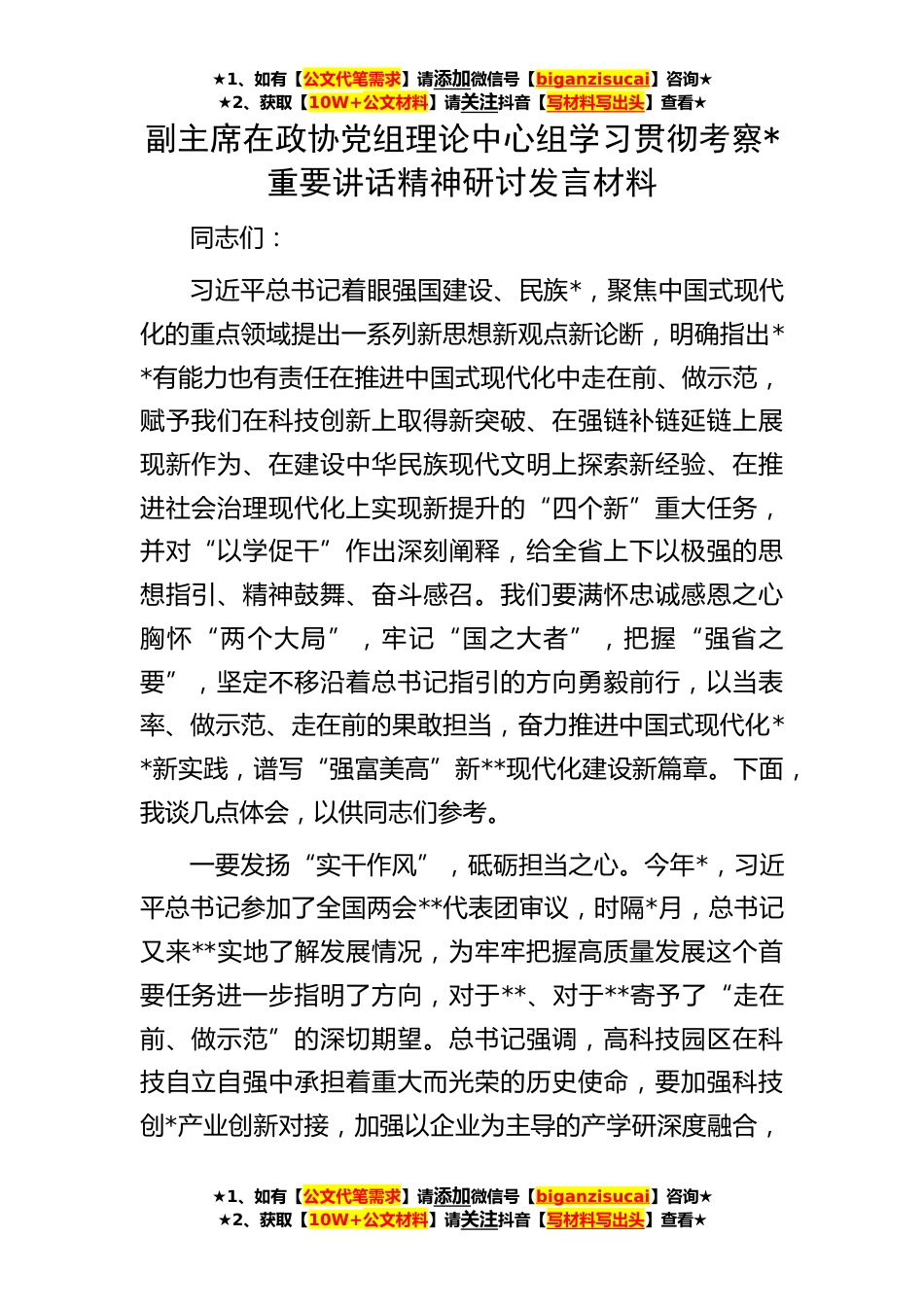 ★1、如有【公文代笔需求】请添加微信号【biganzisucai】咨询★★2、获取【10W+公文材料】请关注抖音【写材料写出头】查看★★1、如有【公文代笔需求】请添加微信号【biganzisucai】咨询★★2、获取【10W+公文材料】请关注抖音【写材料写出头】查看★★1、如有【公文代笔需求】请添加微信号【biganzisucai】咨询★★2、获取【10W+公文材料】请关注抖音【写材料写出头】查看★副主席在政协党组理论中心组学习贯彻考察*重要讲话精神研讨发言材料同志们:习近平总书记着眼强国建设、民族*,聚焦中国式现代化的重点领域提出一系列新思想新观点新论断,明确指出**有能力也有责任在推进中国式现代化中走在前、做示范,赋予我们在科技创新上取得新突破、在强链补链延链上展现新作为、在建设中华民族现代文明上探索新经验...