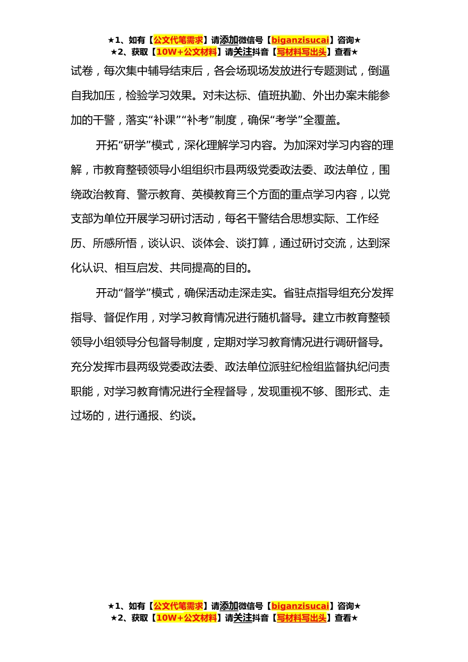 ★1、如有【公文代笔需求】请添加微信号【biganzisucai】咨询★★2、获取【10W+公文材料】请关注抖音【写材料写出头】查看★“”创新五学模式扎实推进学习教育*峡市在全国教育整顿试点经验基础上,按照省教育整顿领导小组办公室指定的学习方式、学习内容,与省第十二驻点指导组共“同研究,高起点谋划学习教育环节总体安排,积极探索创新了五”学模式,着力在缓解工学矛盾、提升学习实效上下功夫,努力推动学习教育有序有效开展。“”开启夜学模式,着力缓解工学矛盾。针对政法工作性质特殊、办案压力大、人员力量不足的实际,市教育整顿领导小组通过“”视频形式开办夜间大讲堂,在市本级设主会场,在市县两级党委政法委、政法单位设置*分会场,利用晚上时间对全体干警进行集中辅导。围绕学习教育环节核心内容,...