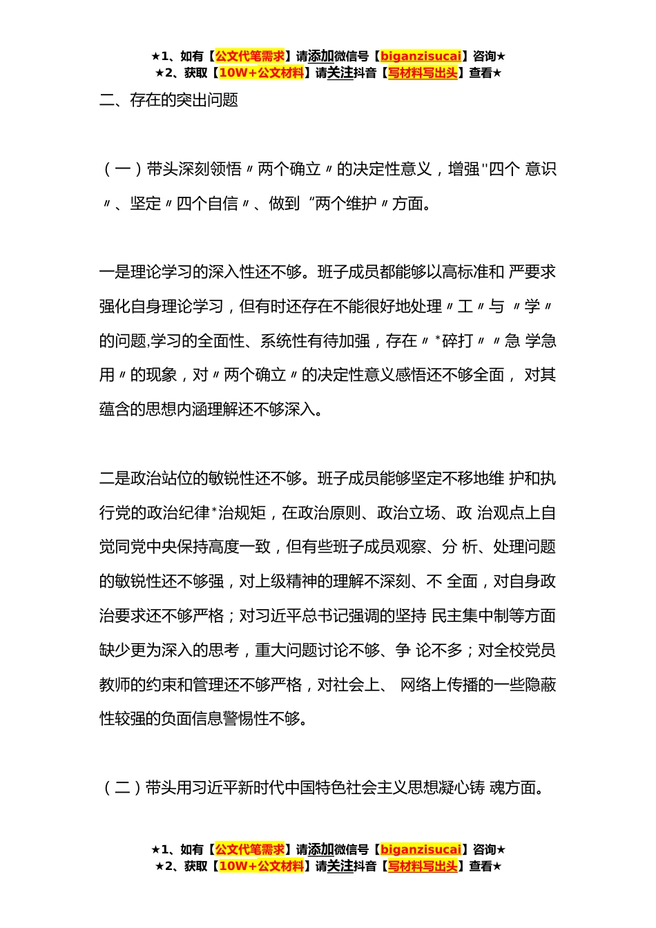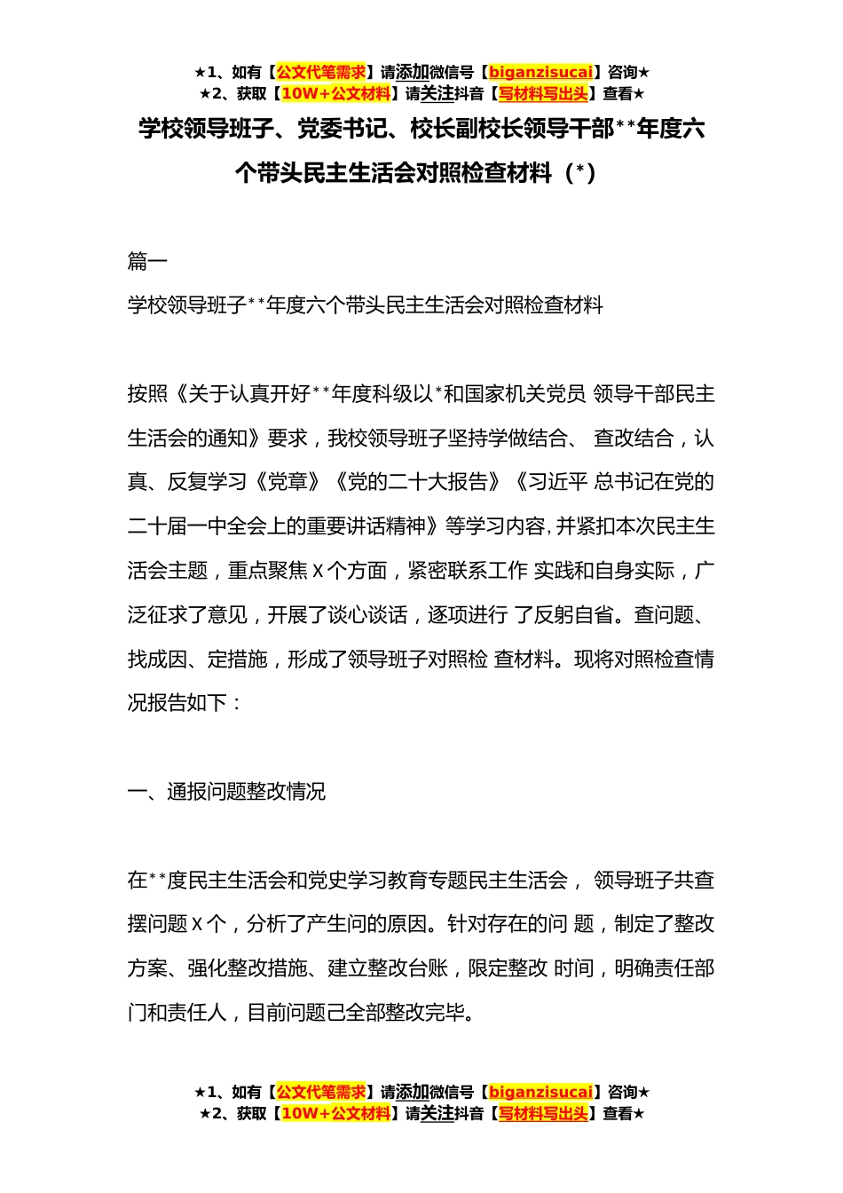 ★1、如有【公文代笔需求】请添加微信号【biganzisucai】咨询★★2、获取【10W+公文材料】请关注抖音【写材料写出头】查看★学校领导班子、党委书记、校长副校长领导干部**年度六个带头民主生活会对照检查材料(*)篇一学校领导班子**年度六个带头民主生活会对照检查材料按照《关于认真开好**年度科级以*和国家机关党员领导干部民主生活会的通知》要求,我校领导班子坚持学做结合、查改结合,认真、反复学习《党章》《党的二十大报告》《习近平总书记在党的二十届一中全会上的重要讲话精神》等学习内容,并紧扣本次民主生活会主题,重点聚焦X个方面,紧密联系工作实践和自身实际,广泛征求了意见,开展了谈心谈话,逐项进行了反躬自省。查问题、找成因、定措施,形成了领导班子对照检查材料。现将对照检查情况报告...