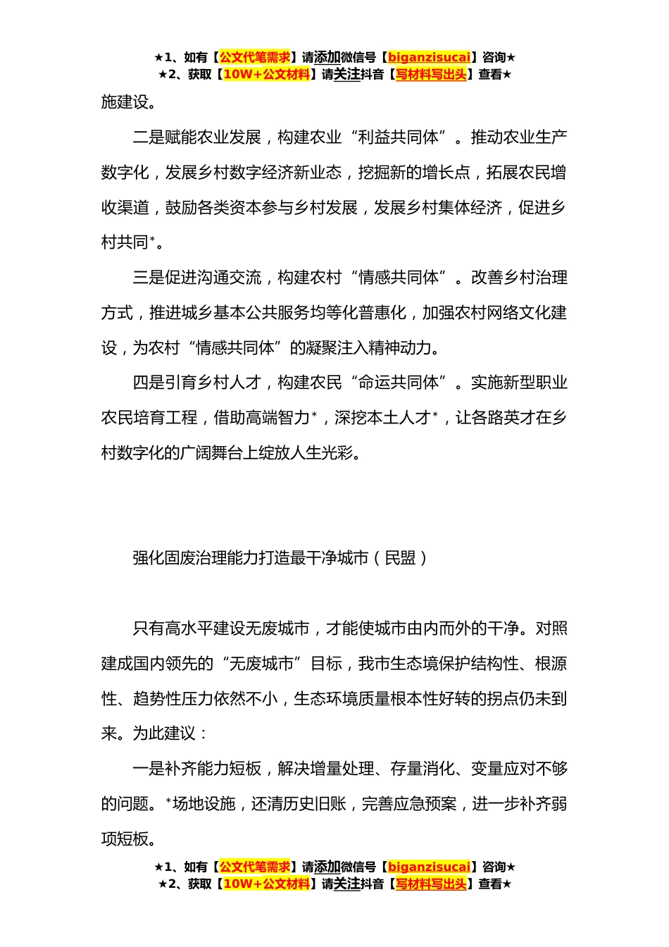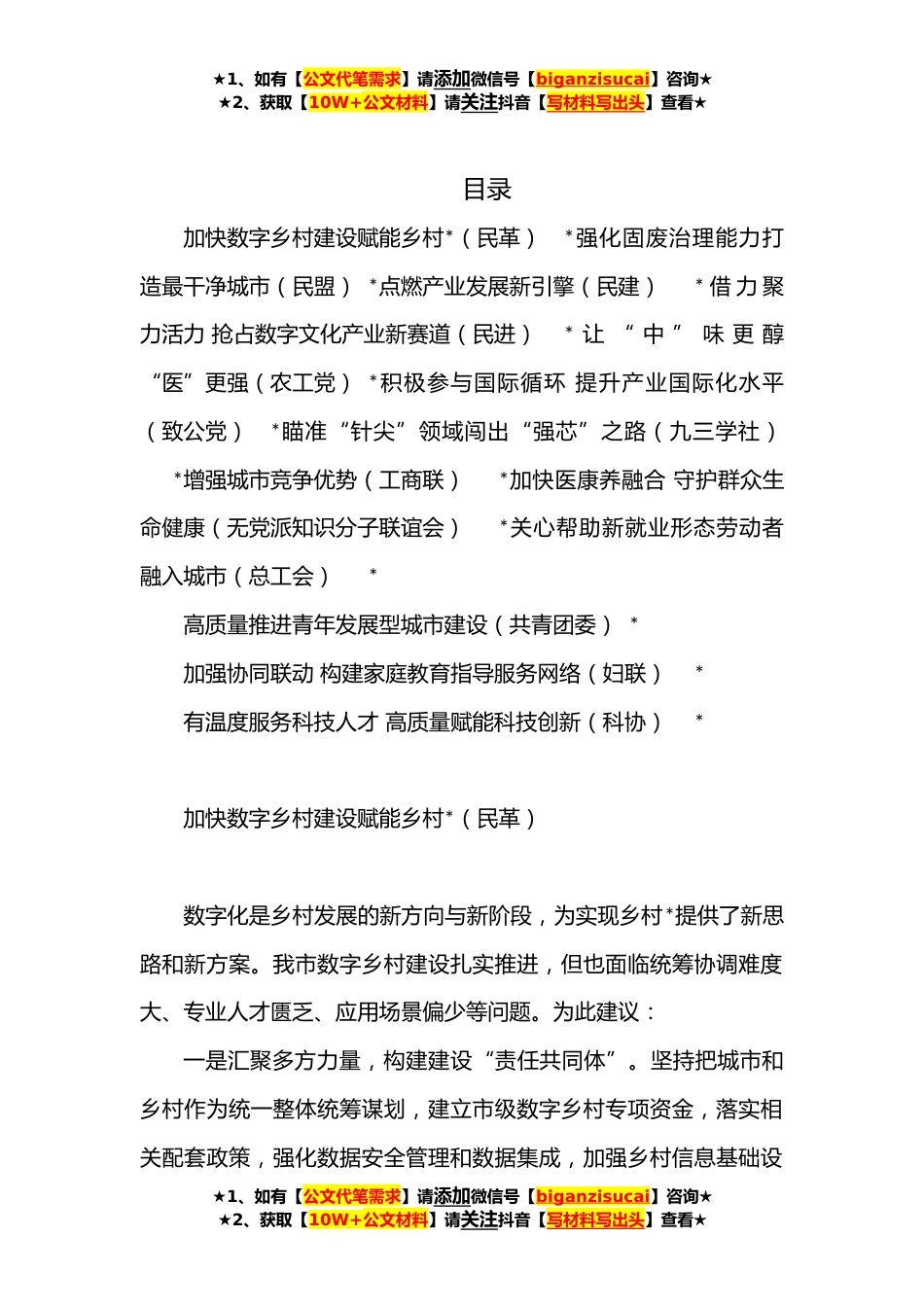 ★1、如有【公文代笔需求】请添加微信号【biganzisucai】咨询★★2、获取【10W+公文材料】请关注抖音【写材料写出头】查看★目录加快数字乡村建设赋能乡村*(民革)*强化固废治理能力打造最干净城市(民盟)*点燃产业发展新引擎(民建)*借力聚力活力抢占数字文化产业新赛道(民进)*让“中”味更醇“医”更强(农工党)*积极参与国际循环提升产业国际化水平(致公党)*瞄准“针尖”领域闯出“强芯”之路(九三学社)*增强城市竞争优势(工商联)*加快医康养融合守护群众生命健康(无党派知识分子联谊会)*关心帮助新就业形态劳动者融入城市(总工会)*高质量推进青年发展型城市建设(共青团委)*加强协同联动构建家庭教育指导服务网络(妇联)*有温度服务科技人才高质量赋能科技创新(科协)*加快数字乡村建设赋...