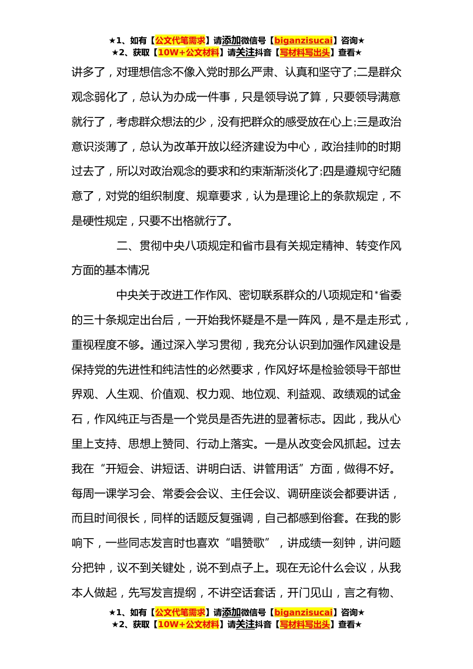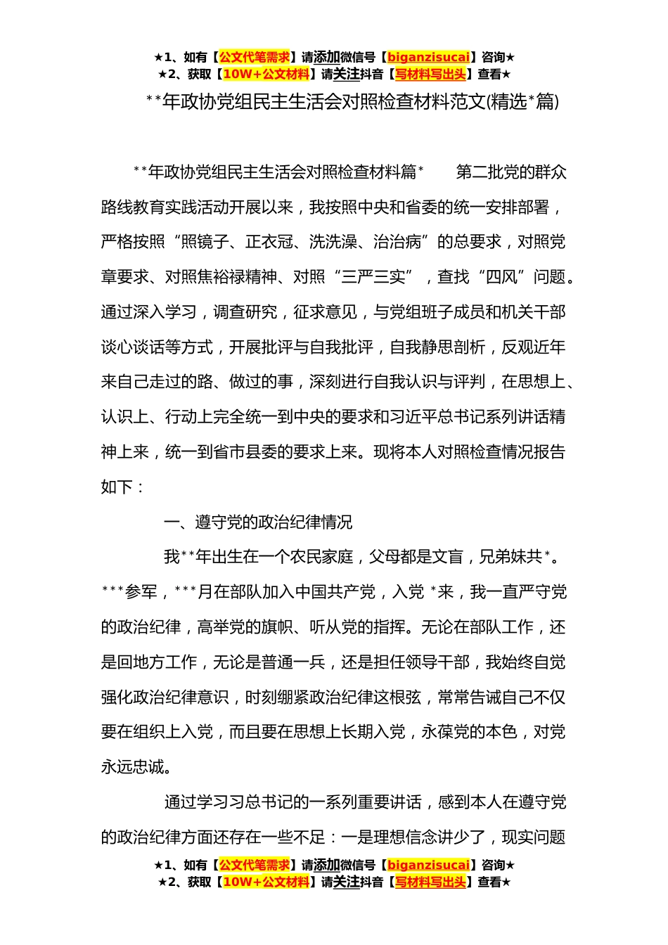 ★1、如有【公文代笔需求】请添加微信号【biganzisucai】咨询★★2、获取【10W+公文材料】请关注抖音【写材料写出头】查看★**年政协党组民主生活会对照检查材料范文(精选*篇)**年政协党组民主生活会对照检查材料篇*第二批党的群众路线教育实践活动开展以来,我按照中央和省委的统一安排部署,严格按照“照镜子、正衣冠、洗洗澡、治治病”的总要求,对照党章要求、对照焦裕禄精神、对照“三严三实”,查找“四风”问题。通过深入学习,调查研究,征求意见,与党组班子成员和机关干部谈心谈话等方式,开展批评与自我批评,自我静思剖析,反观近年来自己走过的路、做过的事,深刻进行自我认识与评判,在思想上、认识上、行动上完全统一到中央的要求和习近平总书记系列讲话精神上来,统一到省市县委的要求上来。现将...